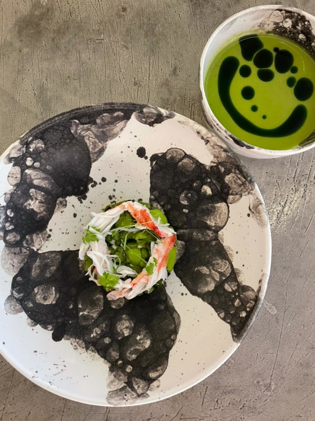Ферментации быть! Шеф Павел Демин подает окрошку (460 руб) из молодого зелёного горошка с крабом, ферментированными побегами ели и сливочным хреном.