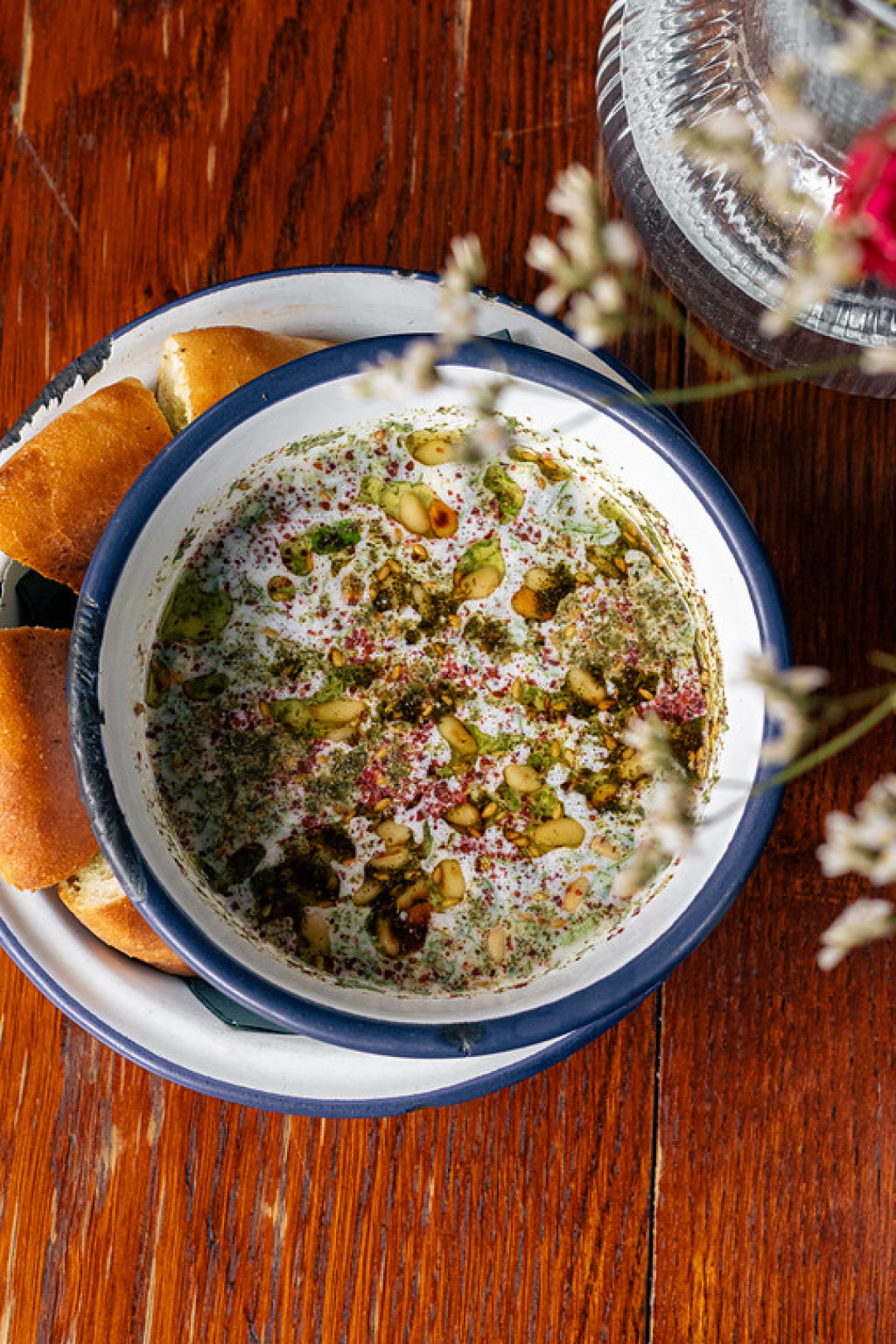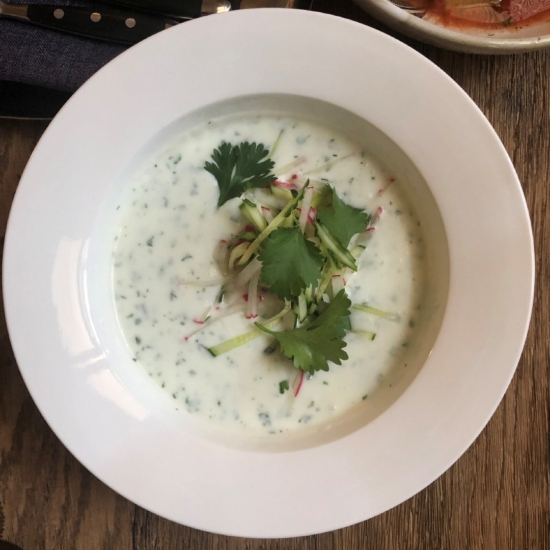 Израильский суп (390 руб) готовят из йогурта, добавляя ароматные специи заатар и сумах. Свежих оттенков добавляют огурец, мята и цедрой лайма.