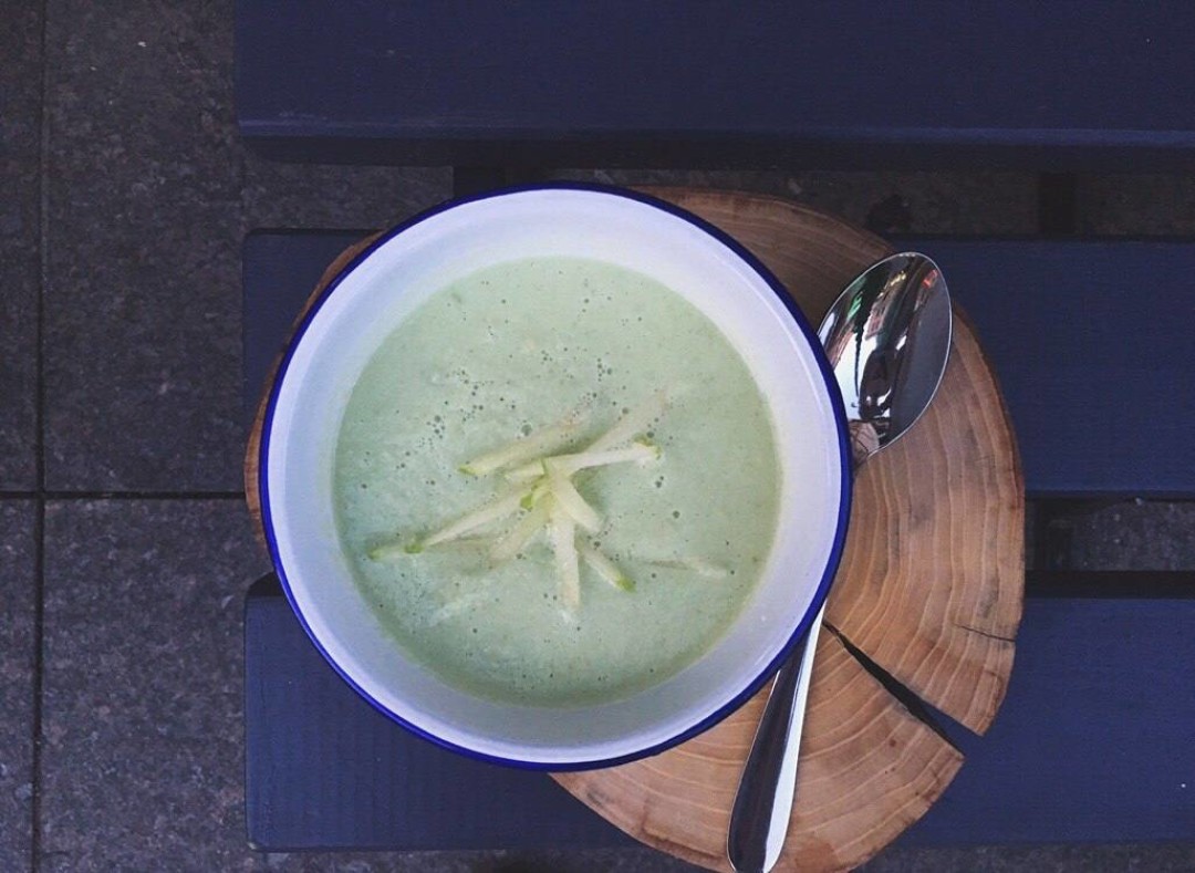Огуречный крем-суп (350₽) на взбитом йогурте с авокадо и перцем ласточкой для вас украсят яблоком и сбрызнут соком лайма.