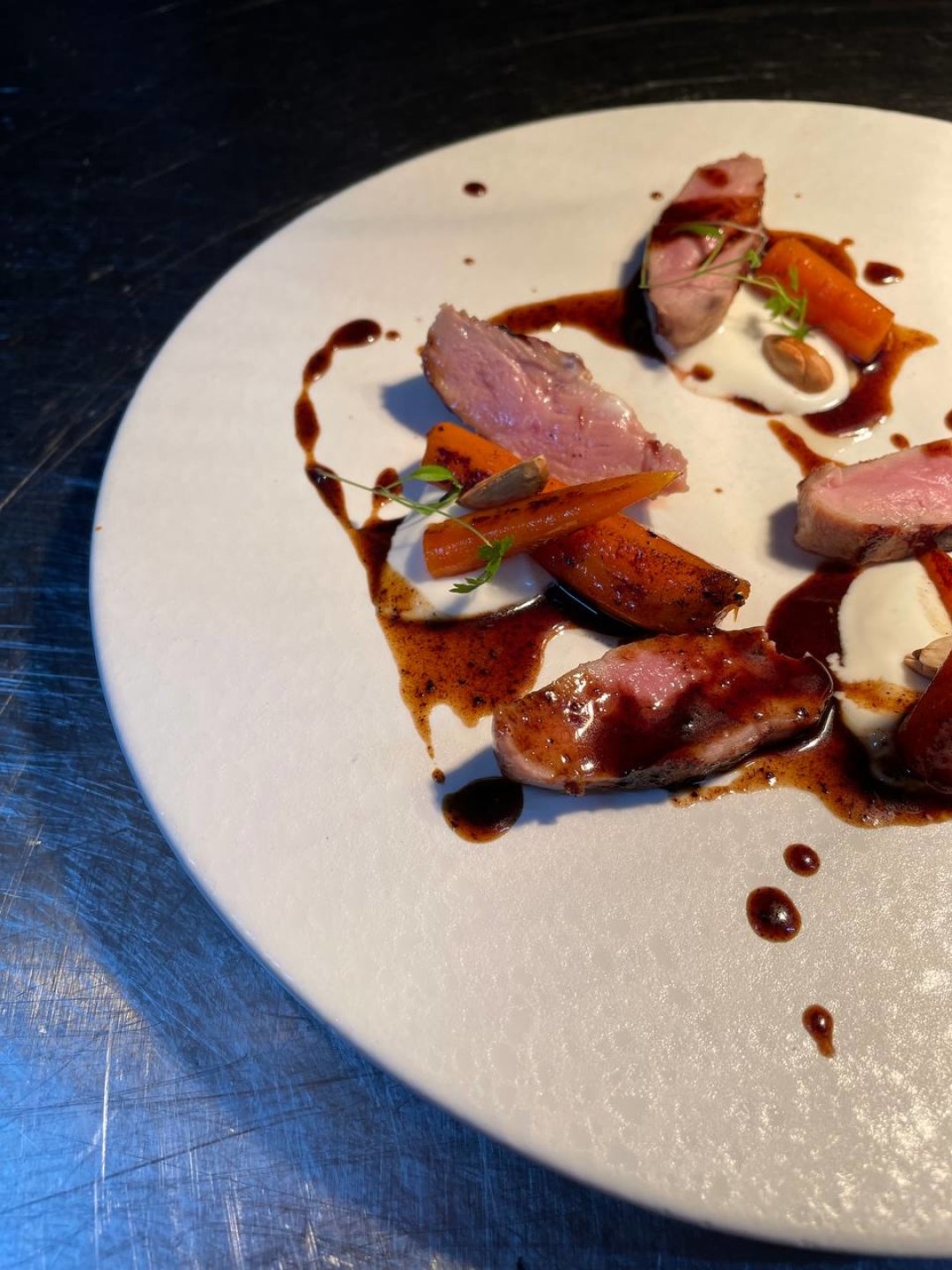 - Утиная грудка со свеклой, капустой кейл, черешней (950 руб.) при участии конюшни и фермы «Белая Русь».