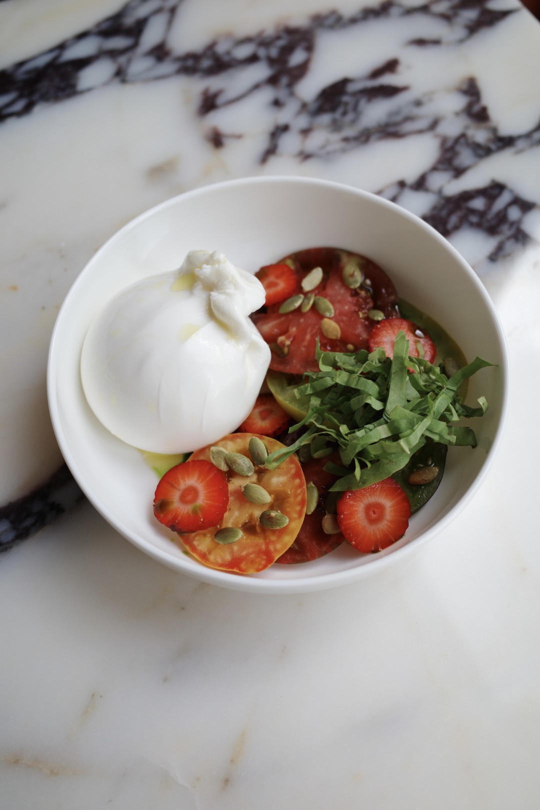 Буррата от «Первой итальянской сыроварни» с клубникой от «Фермы Болотова» и свежими томатами (650 руб.).