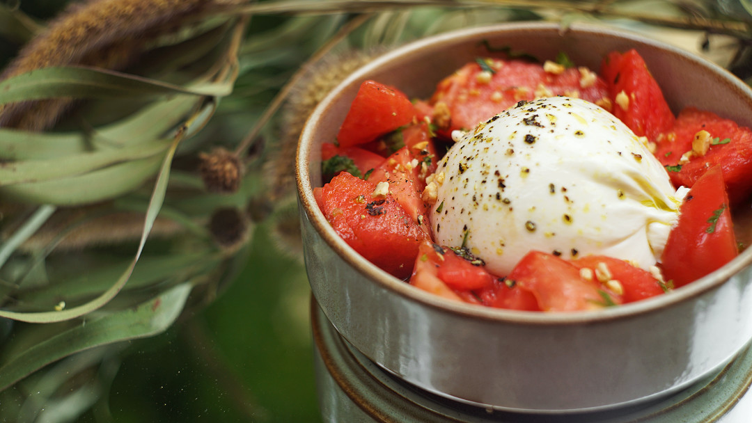 Буррата с арбузом и томатами (590 руб.) из продуктов от фермы «Медовое»
