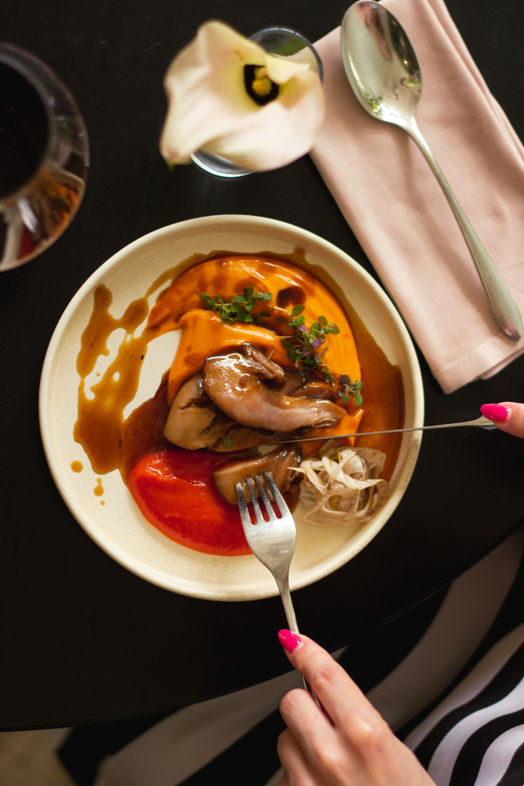- Язычки ягненка со сливочным кремом из батата, маринованным фенхелем, соусом медовый демиглас и кремом из печеного перца (680 руб.).