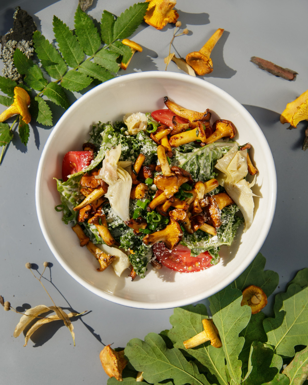 - Салат с кейлом, лисичками, артишоками и пармезаном (570 руб.) — «Жили Растили»;