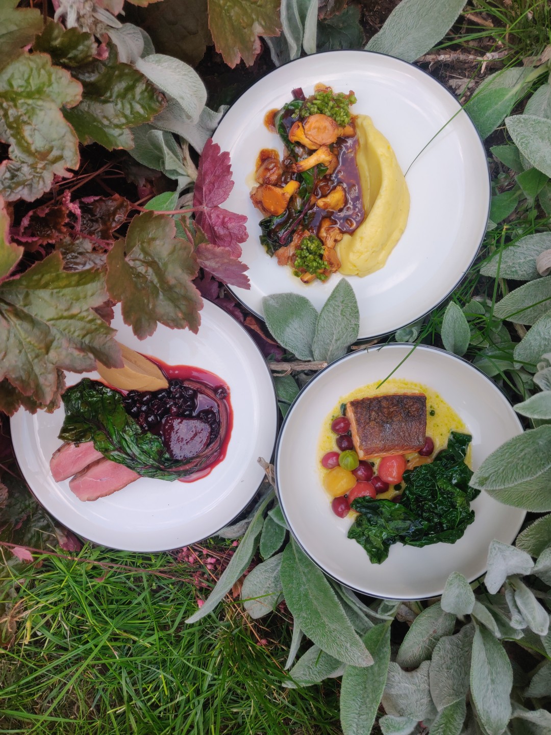- утиная печёнка с копчёной свёклой, осётр с печёным пореем, зелёным горошком и луковым бульоном;