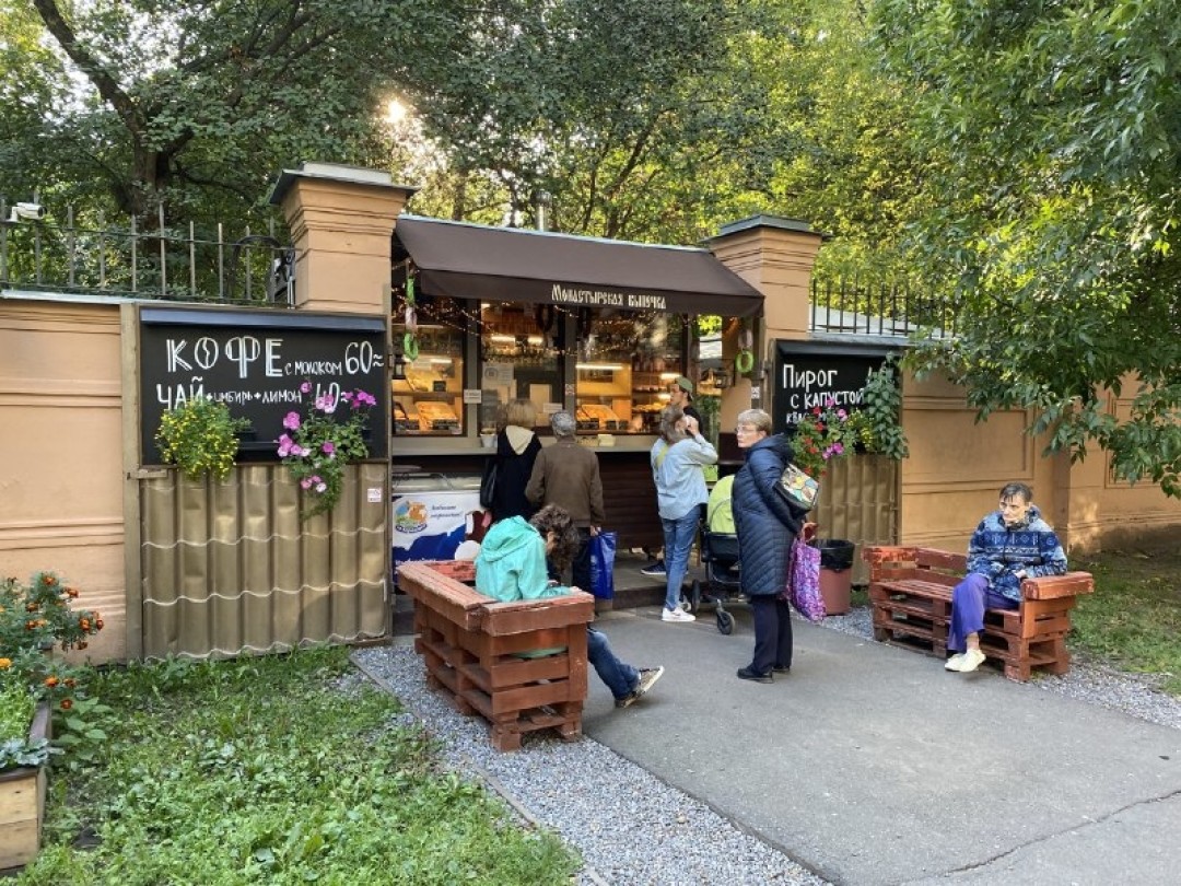 При кафе есть даже своеобразная открытая терраса. По 15 линии Васильевского острова рядом с церковью стоит небольшая лавка с монастырской выпечкой навынос. В теплое время можно устроиться на скамейке с очень широкими подлокотниками, почти заменяющими стол.