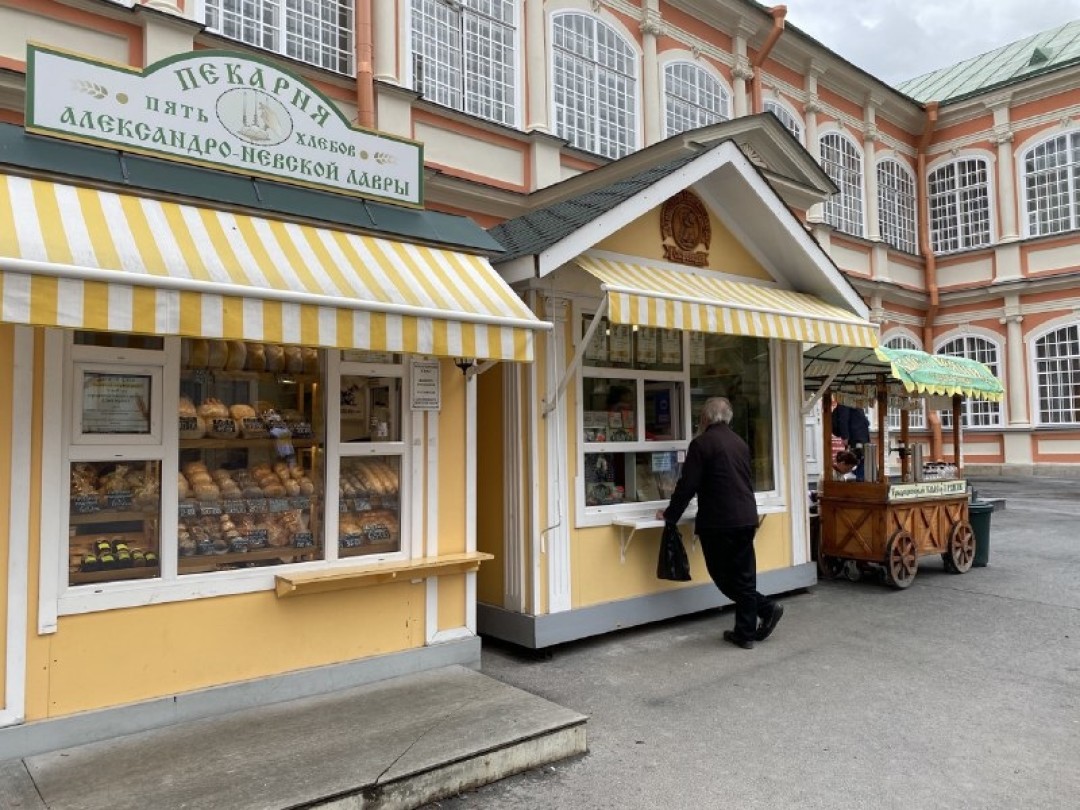 Недалеко от входа в Лавру работают желтые домики, похожие на пряничные, — сырный и хлебный. Здесь можно запастись монастырской продукцией собственного производства.