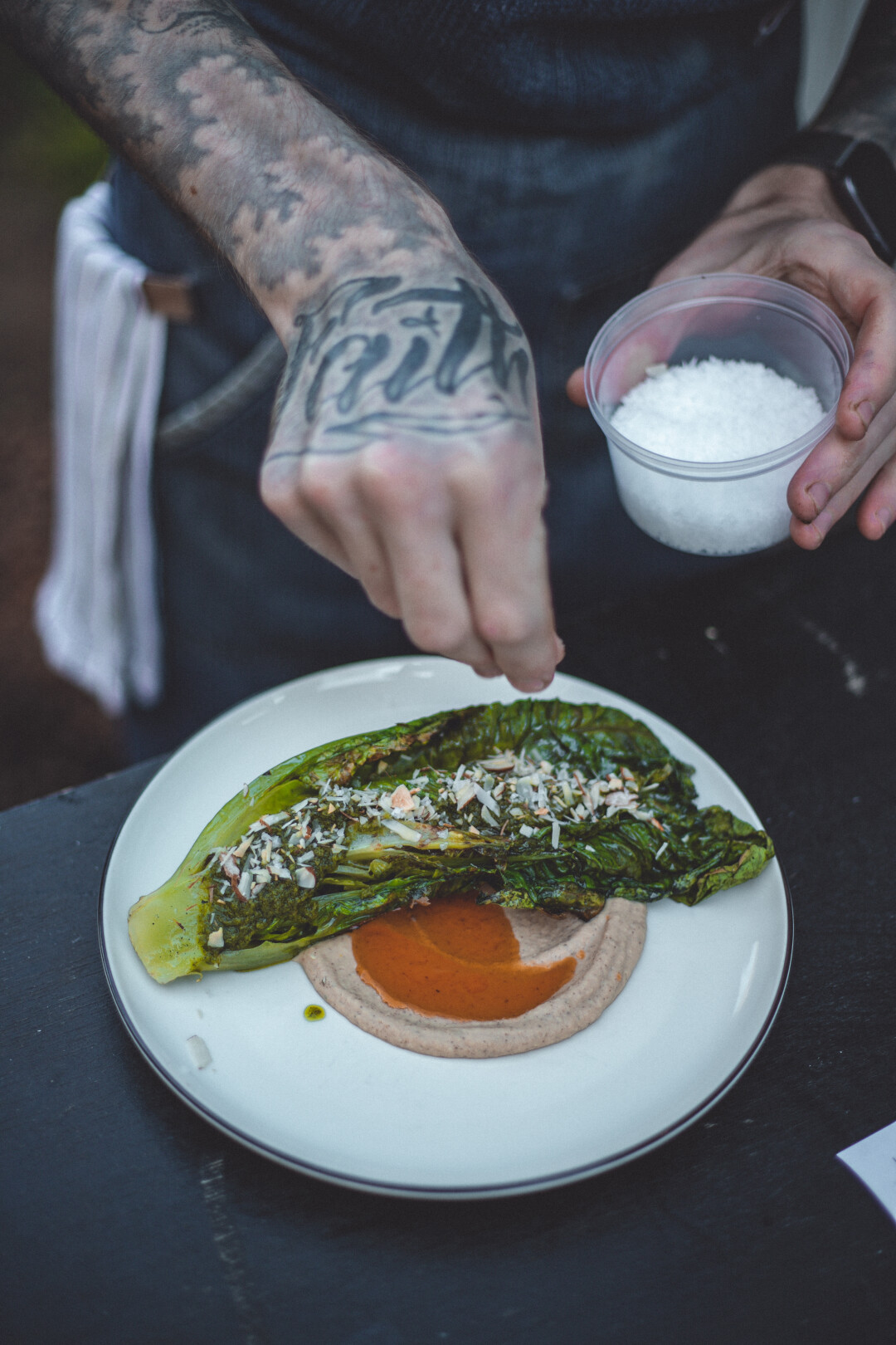 Хумус из кольраби («Жили-Растили») с жареным суджуком и домашней лепешкой; кебаб из утки с тартаром из клубники и ревеня («Хутор Барышево»)