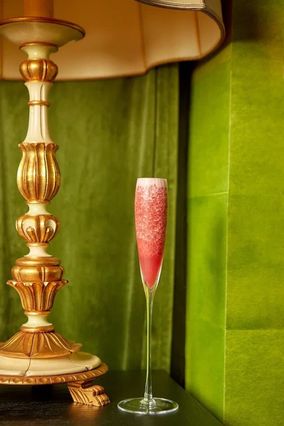 Только посмотрите на этот длиннющий флюте с коктейлем «Россини» – это легкий напиток с нежным ягодным вкусом. По одной из версий, его изобрел итальянец Джузеппе Чиприани, тот самый хозяин бара, что в 1930-е создал популярный «Беллини». В составе: пюре земляники, ревень, безалкогольное игристое вино.