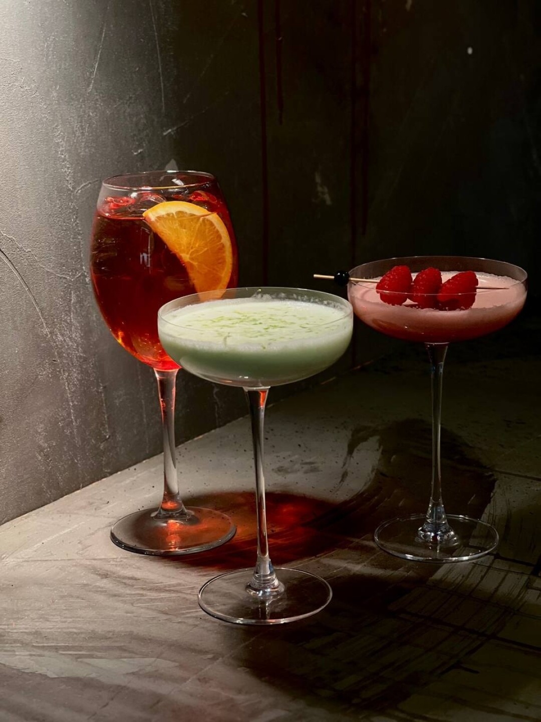 Сгроппино здесь делают миндально-лаймовым, в Clover Club добавляют безалкогольный амаро, сохраняя малину, лимон и белок по классике, а ЗОЖ-спритц готовят с цитрусовым сиропом, который как две капли воды похож на горький аперитив, безалкогольным игристым и апельсином.