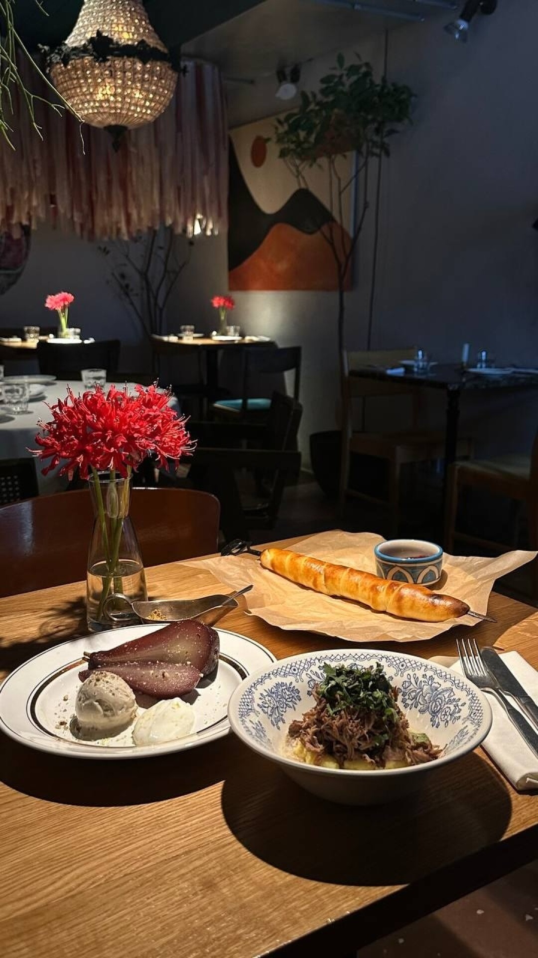 Завершаем первую рабочую неделю нового года нарядными спешл-блюдами в Nino. Например, хачапури на шампуре (!) с соусом из ежевики, праздничное рагу из индейки с саперави и пряная груша в вине с мороженым из халвы.