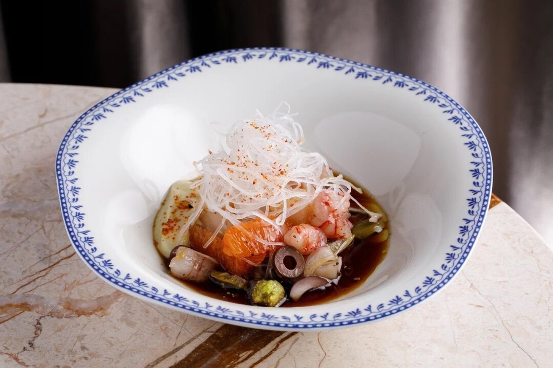 Обязательно пробуйте лепешку окономияки с крабом и страчателлой и тартар из креветки ама-эби с гребешком и понзу из сицилиского апельсина.