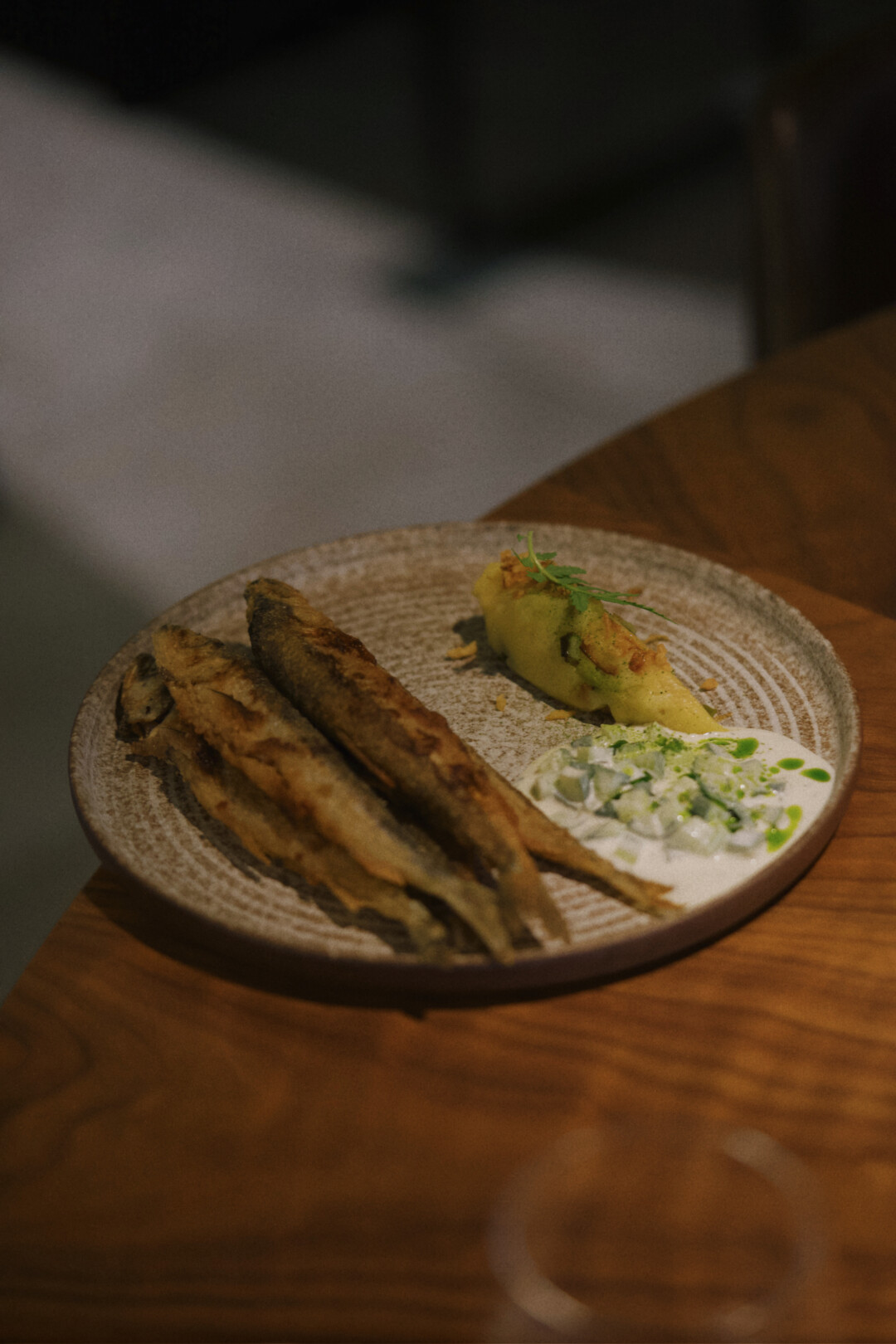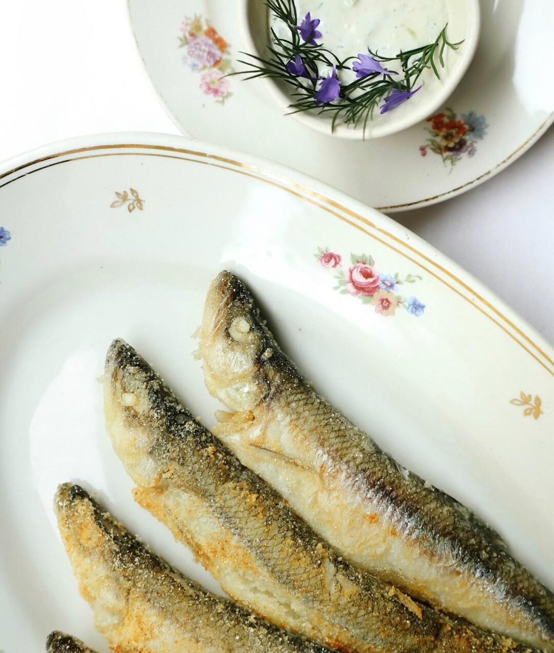 В авторском ресторане с шоу-подачами сезонную корюшку обжаривают и выкладывают на тарелку вместе с молодым печёным картофелем в масле нуазет и соусом из йогурта и огурца.