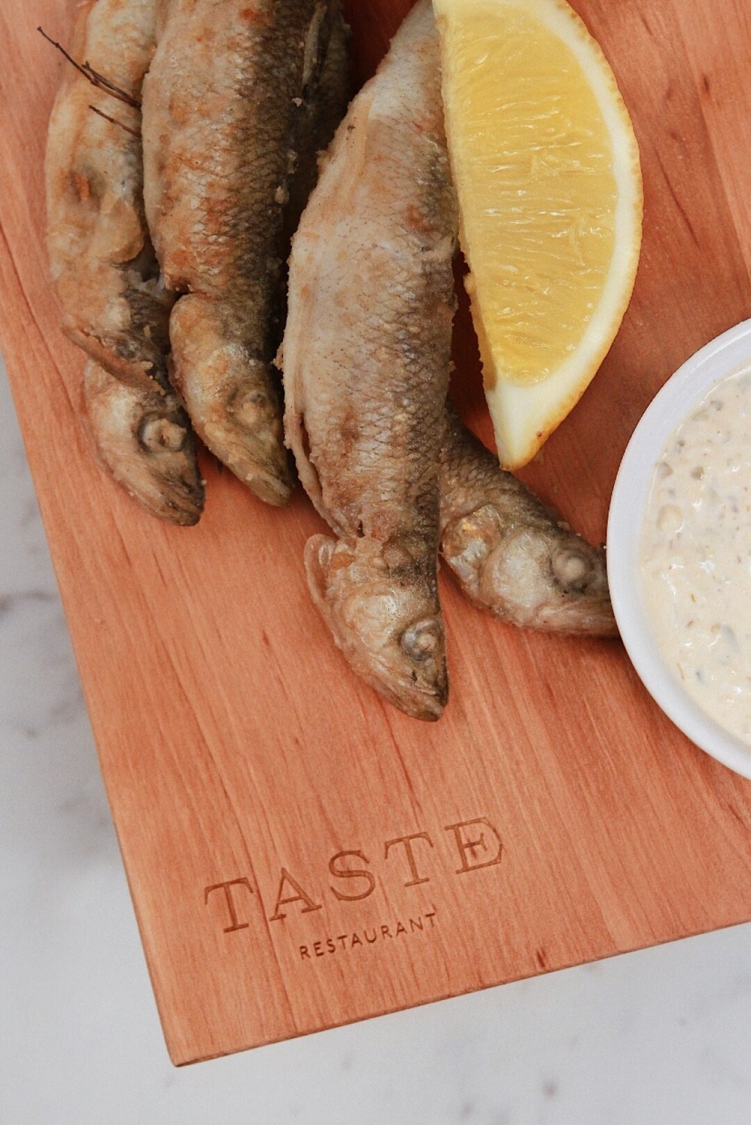 Первая в этом сезоне рыбка замечена в «Саду» — подают в жареном виде с соусом дзадзики из йогурта, свежего огурца и чеснока.