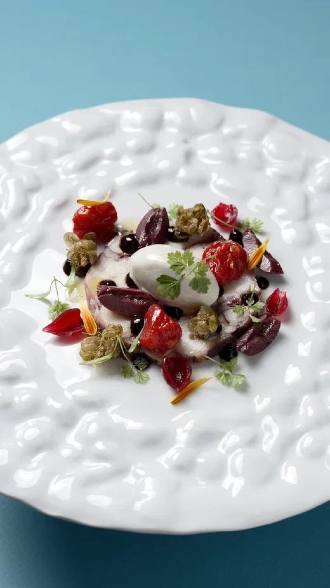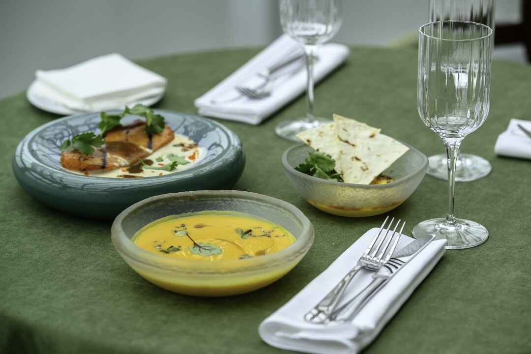 Первым основным курсом представят авторскую интерпретацию испанского супа гаспачо 3 микс свежих овощей со сладкой фалангой камчатского краба с мороженым из кинзы. Том ям же у шефа Артема Гребенщикова — в виде кальмара, фаршированного креветкой, с кремом из жареного картофеля на кокосовом молоке. А следующее блюдо посвящено петербургской кухне как феномену: в тарелке местная утка с пюре из овощей и ананасов с соусом из мясного сока с бобами тонка.