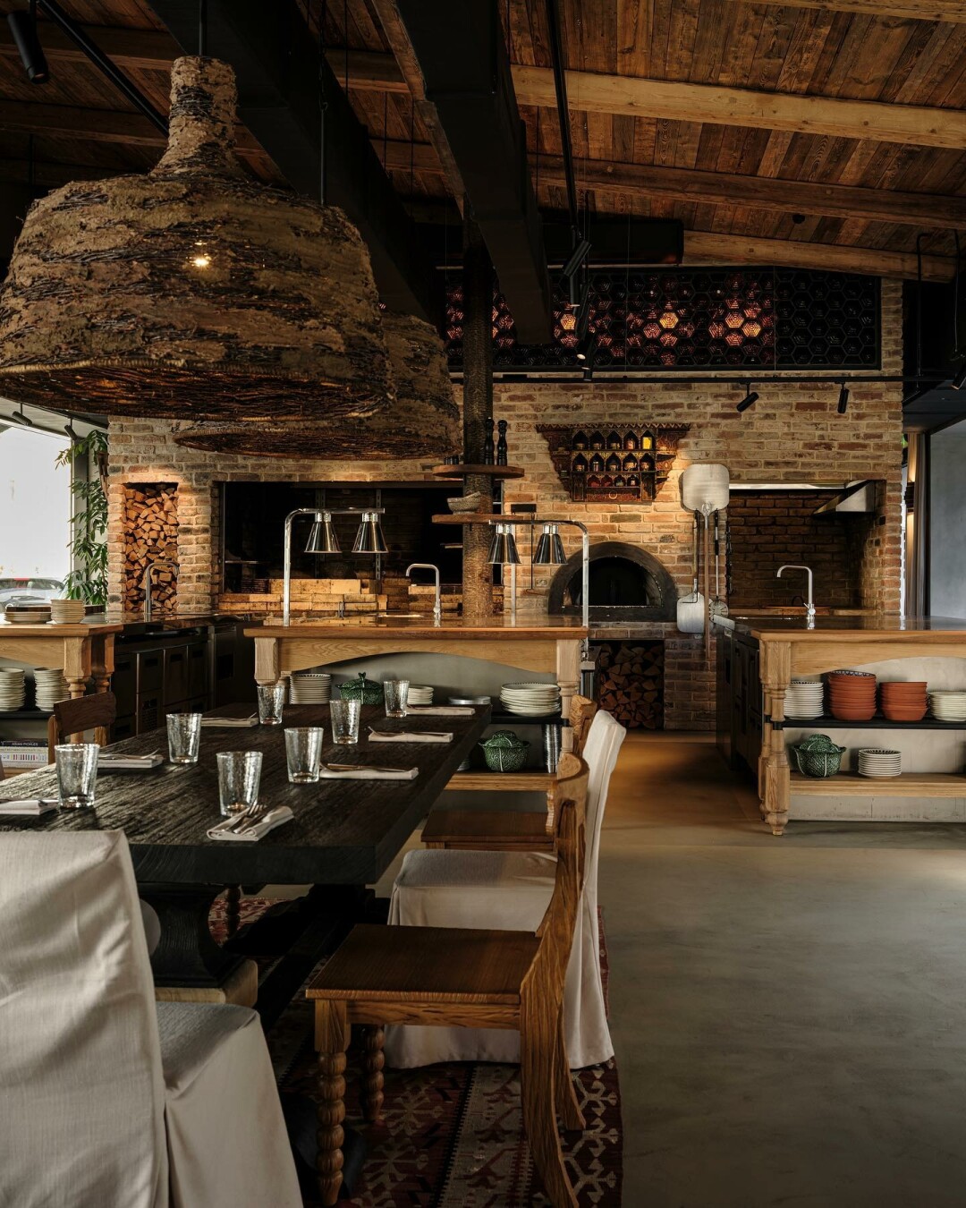 Ресторан, в прямом смысле построенный командой Lucky Group вокруг открытого огня. Овощи, мясо и морских гадов готовят на углях, в печи или тандыре по всем канонам средиземноморской и кавказской кухонь. Пробовать пикантный тартар, хачапури с трюфелем и сарму с курицей и курдюком в свекольных листьях, запивая бульоном из того же горшочка, где готовилась эта интерпретация долмы.