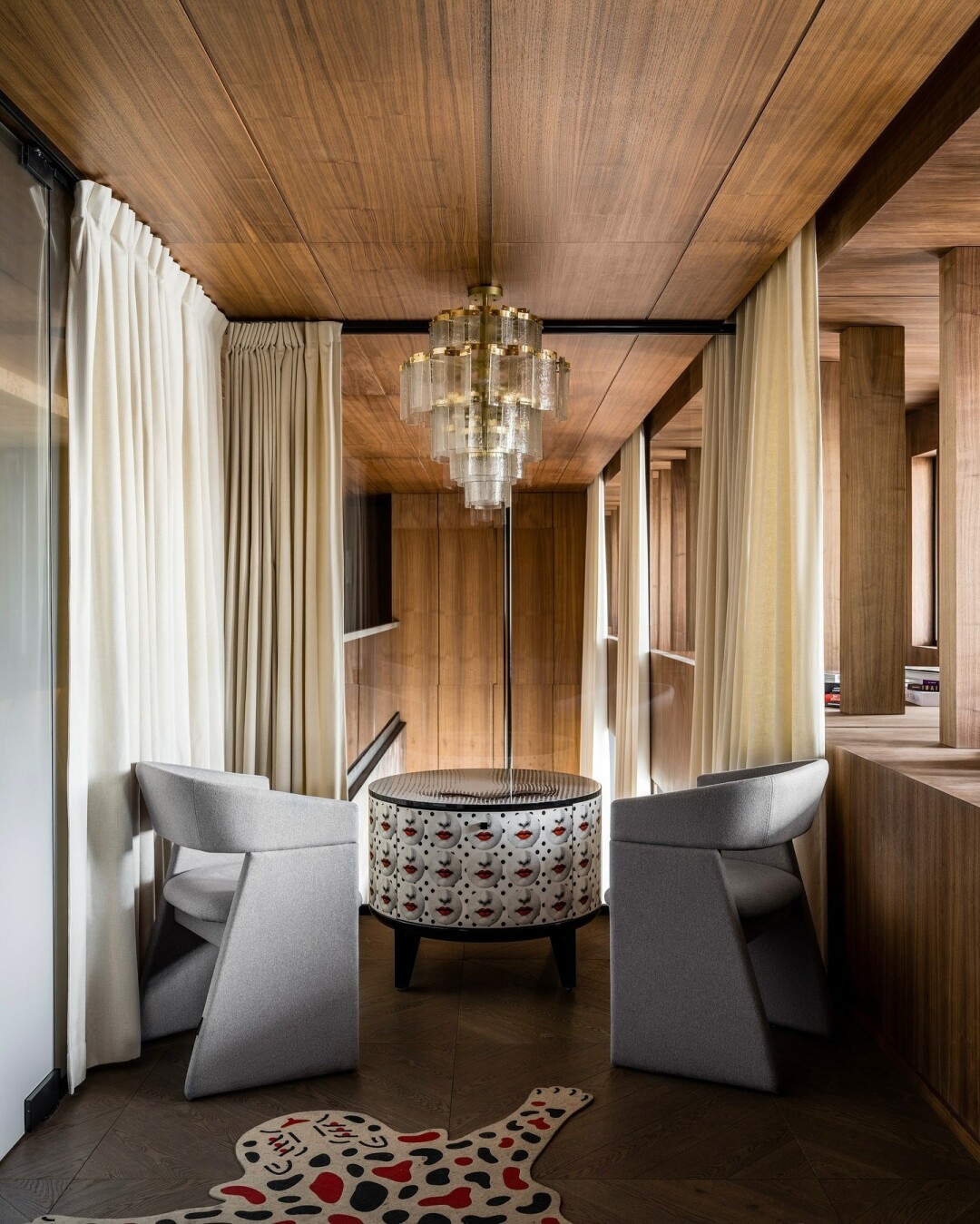 В интерьере от сверхвостребованного (и не зря!) дизайнера Натальи Белоноговой много деревянных деталей, фальконье, колонны, сплетенные вручную светильники из лозы.