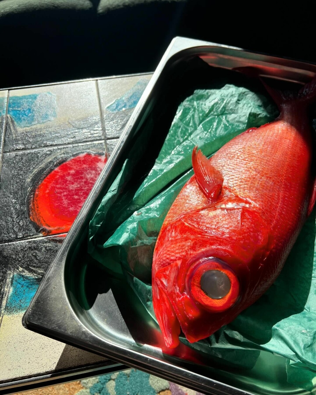 Меню закусок, основных и спешл-блюд живет свою лучшую жизнь и имеет дело как с устрицами и черной икрой, так и с мясными пирожками в пару к Шампани. В сезон ставят арбуз, корюшку, зеленый горошек, инжир и лесные грибы, но и про редкую рыбу не забывают — только посмотрите на этого красавчика-кинмедая на фото.