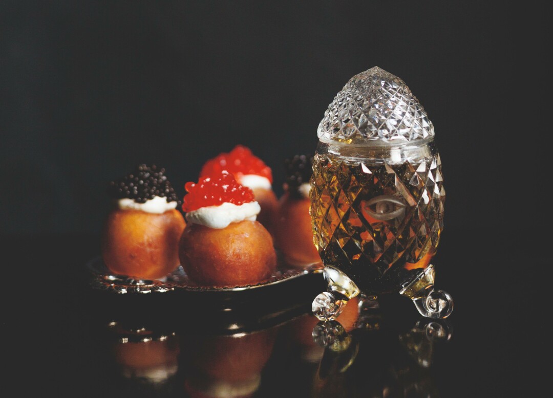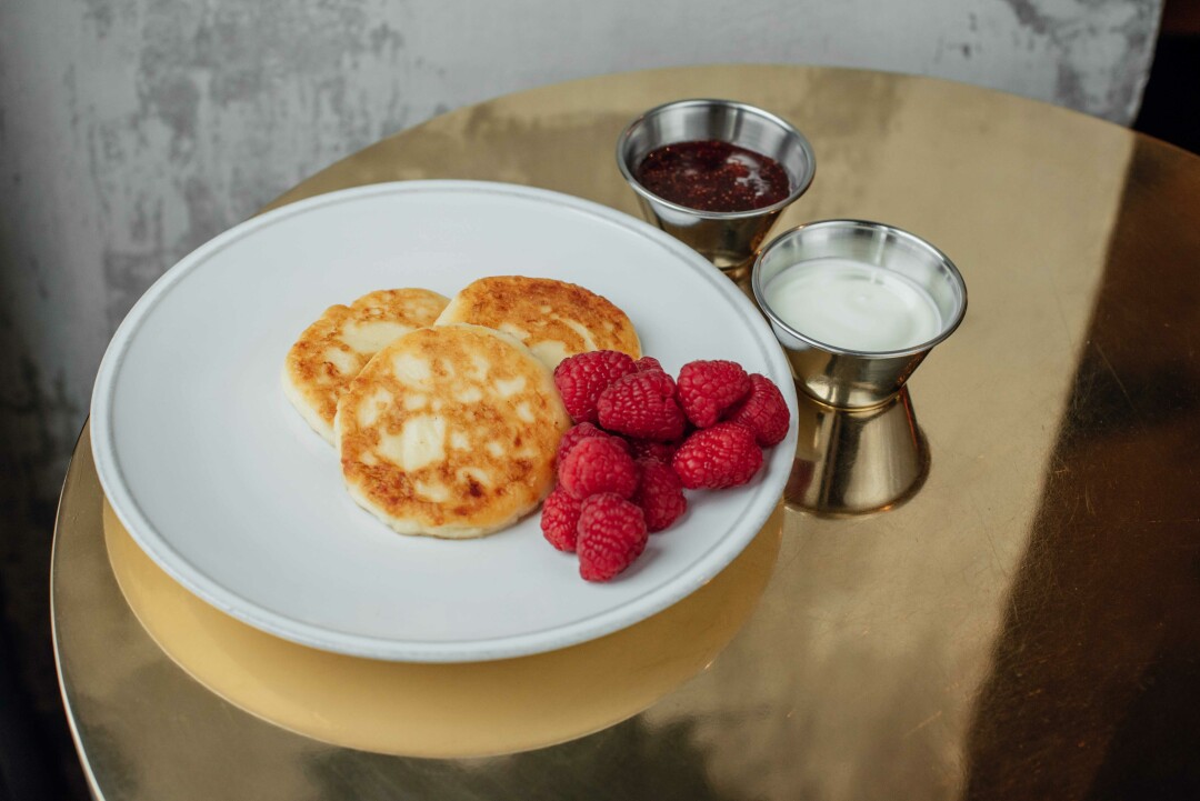 Проект Артема Лосева, Виталия Истомина и Антона Пинского на Патриарших. Бутер с угрем и страчателлой, вареники с крабом и пармезаном, омлет торнадо с креветками и авокадо, драники с креветками и имбирным соусом, творожная запеканка с брусникой, сырники и, конечно, фирменное блюдо «не то, чем кажется» — пара сосисок с горошком, оборачивающиеся глазированными сырками с фисташками.