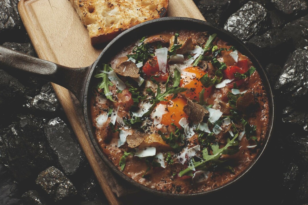 В ресторане не используют для приготовления еды ничего, кроме нескольких винтажных чугунных печек-буржуек, поэтому система вытяжки занимает отдельную комнату. Из меню завтраков стоит обратить внимание именно на то, что лучше всего получается в печи: сырники, гречку с белыми грибами, овсяную кашу с грецкими орехами, фундуком и миндалем, шакшуку, творожные ньокки с пряной вишней и сметанным мороженым и круассаны с разными начинками.