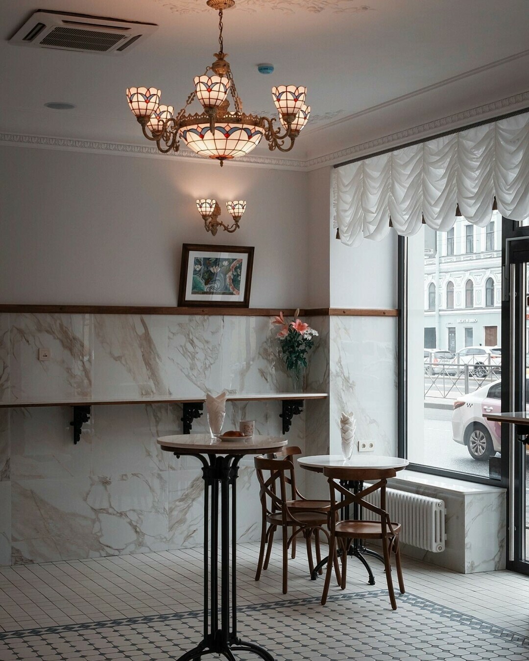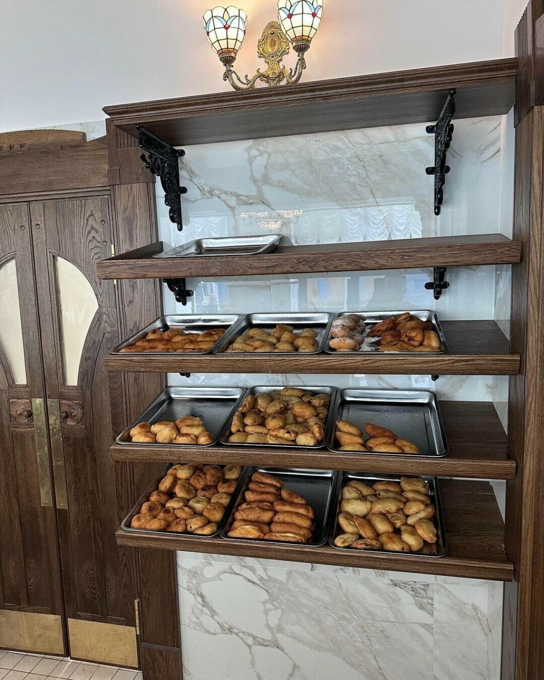 В пирожковой на Лиговском звучит «от печали до радости» и «на теплоходе музыка играет». Белый мрамор и воссозданная по историческим фотографиям лепнина соседствуют с венскими стульями и модерновым буфетом из массива дуба. Отдельного внимания заслуживает резьба по дереву с изображениями Нимфеи (Кувшинки), Болотника и узоров, присущих модерну.