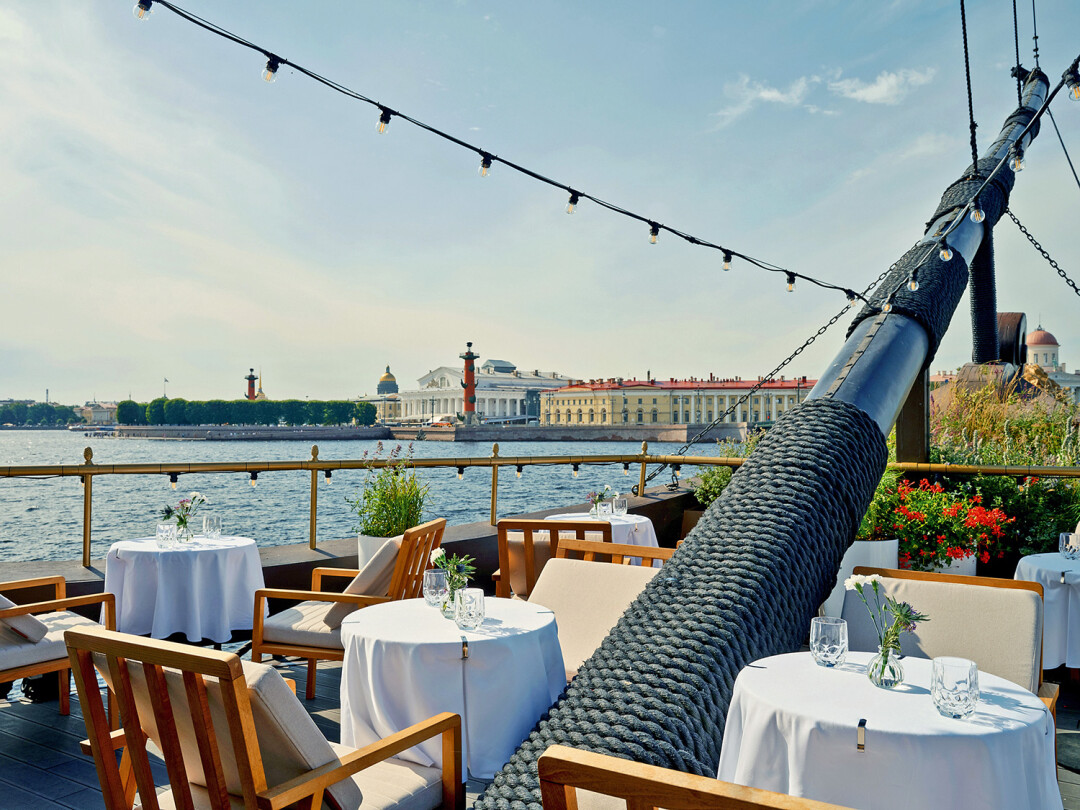 У ресторана Ксении Собчак и Антона Пинского на фрегате «Летучий Голландец» терраса обустроена на носу вместо капитанского мостика. Чтобы подкрепиться голубчиком и крабовым гратеном с хреном, почти швартуясь к Стрелке Васильевского, бронируйте заранее. А за шанс посмотреть с кормы на главный выпускной страны «Алые паруса» придется заплатить депозит до 100 000 рублей.