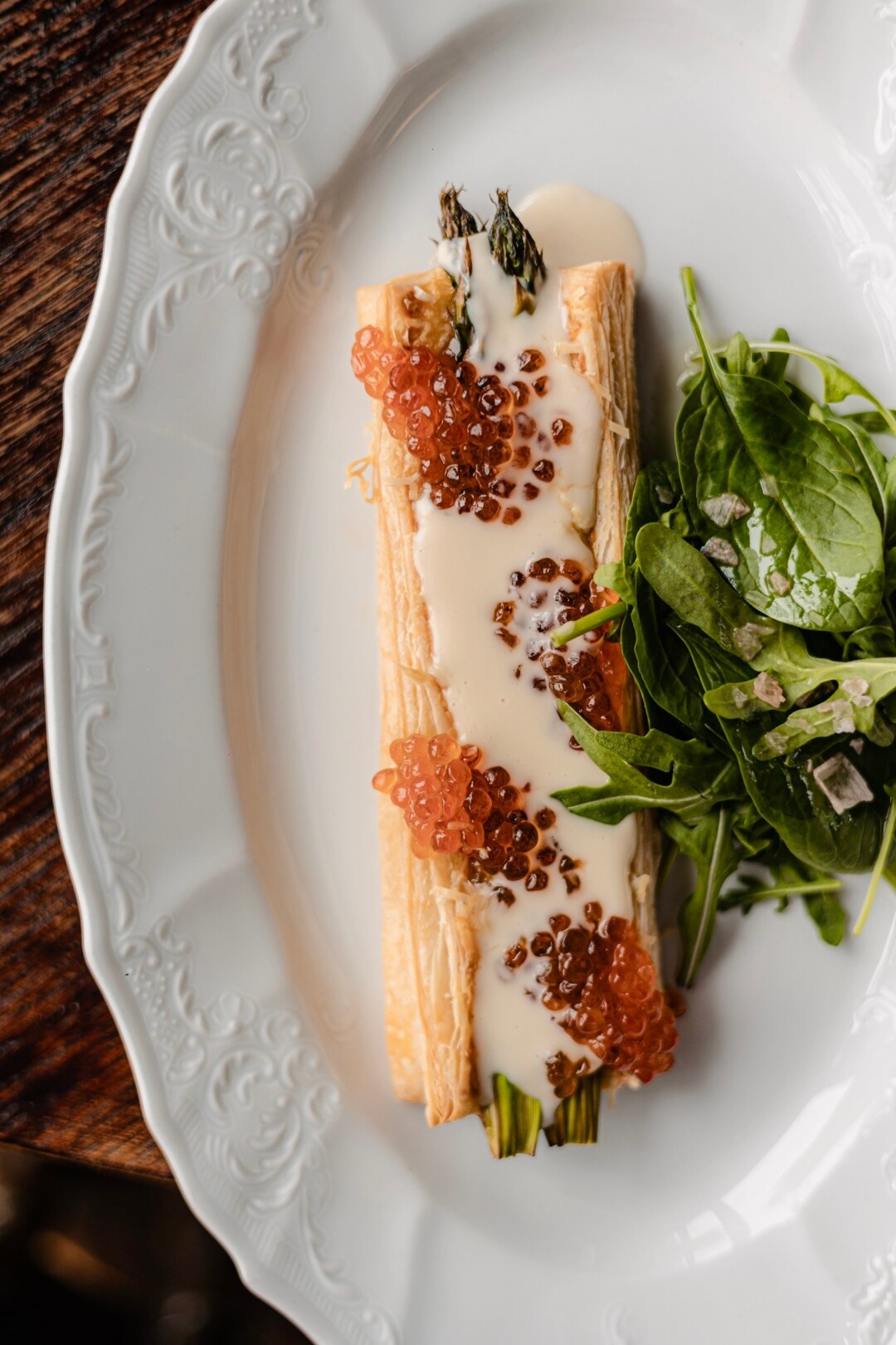 В мясном пабе Blackchops от гастрономических визионеров команды Dreamteam на домашнее слоеное тесто выкладывают зеленую спаржу, посыпают грана подано и запекают, а подают с соусом берблан, в основе которого чеснок (его вываривают в молоке, чтобы избавить от горечи).