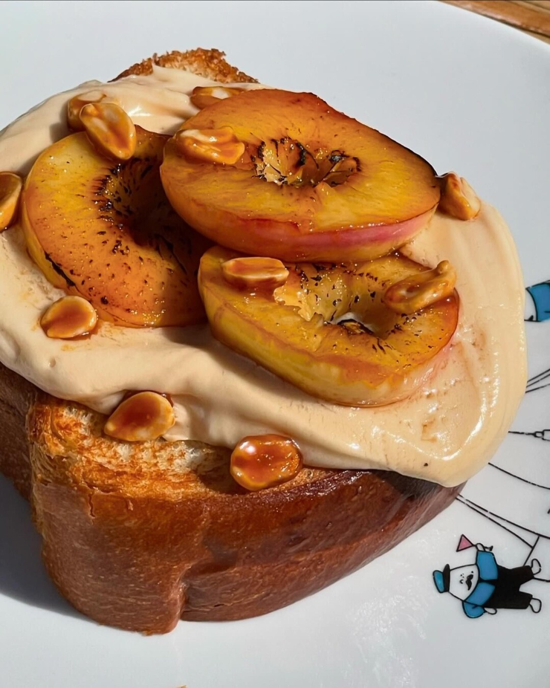 Что-то из касты «фуд-порн». Поджаренная бриошь с арахисовым кремом, сладкие персики, а сверху хрустящий солоноватый арахис в карамели. Совет от шефа: брать вместе с большим апельсиновым фрешем и выходить во двор Василеостровского рынка. Доступен до 9 июня!
