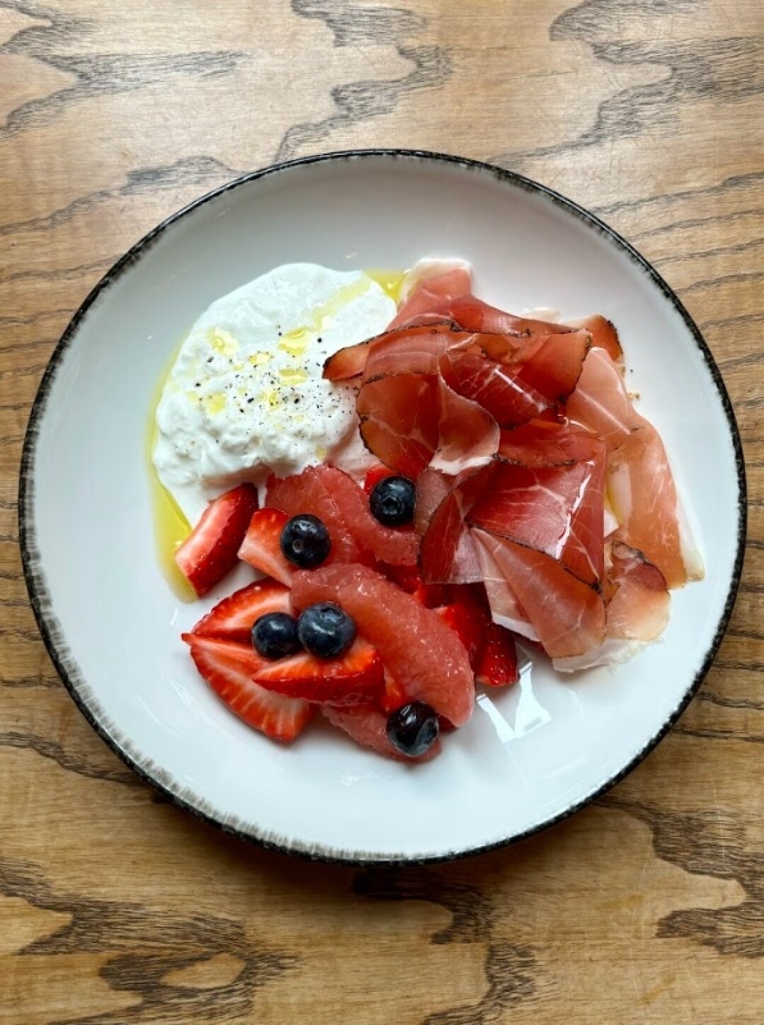 В сезонном гастрономическом лайн-апе звучит свежак, но роль первой скрипки неизменно за настоящими итальянскими деликатесами: прошутто, коппой, мортаделлой, пармезаном и пекорино романо. Наш выбор — мясо и ягоды, а именно шпек и страчателла, дополненные грейпфрутом, клубникой и малиновым соусом.