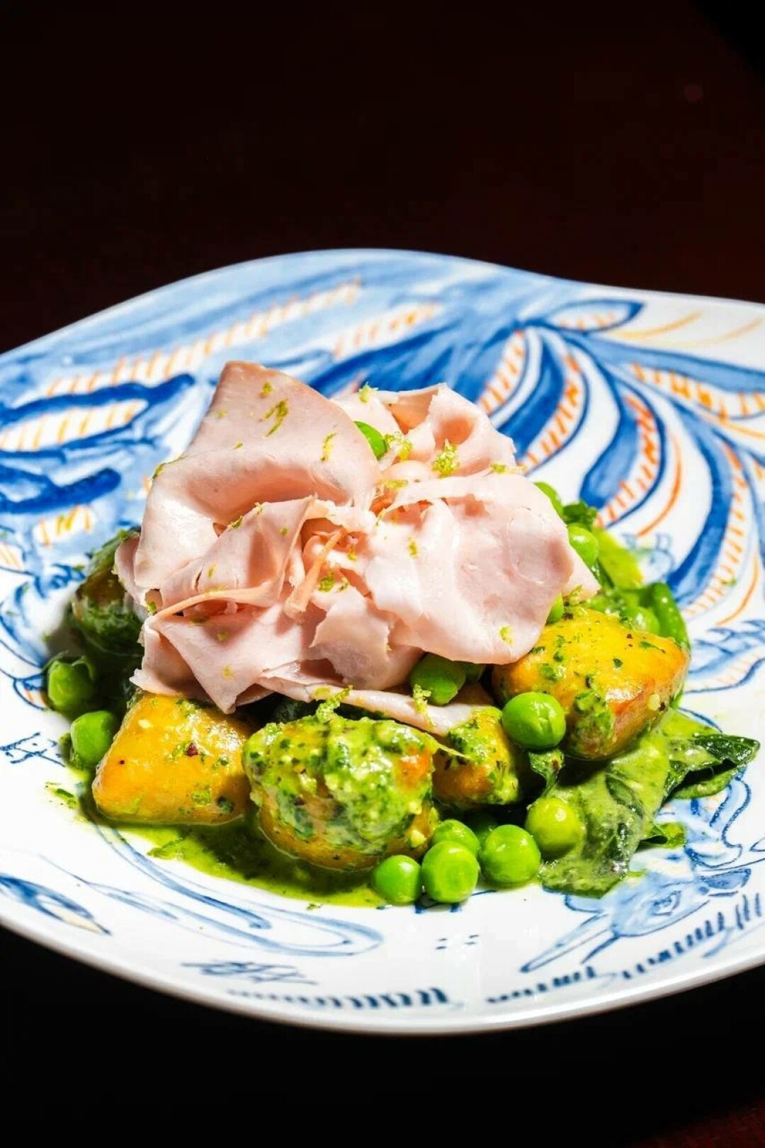 На редких тарелках — коллаборация итальянского бренда Seletti с Diesel — шеф Василий Баканов выдает все самое зеленое и сочное: пробуйте ньокки с мортаделлой, зеленым горошком и песто из щавеля.