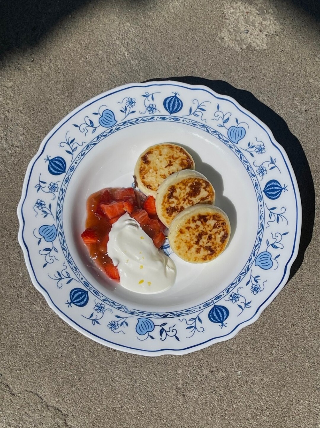 В кофейне, занимающей целый особняк на Черной речке, для вашего завтрака придумали сырники со сметаной и вареньем из сезонных клубники и ревеня.