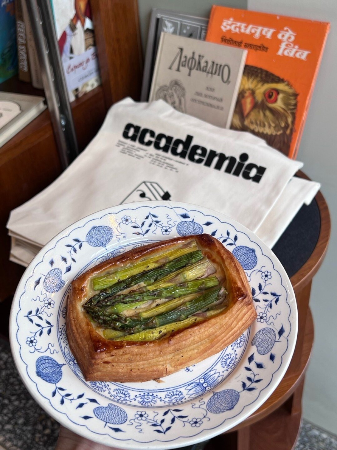 Сезон спаржи объявляем открытым! В кафе при букинистическом магазине «Академия» вернули главный летний бэнгер — слойку с запеченной спаржей, соусом морне, оливковым маслом и черным молотым перцем!
