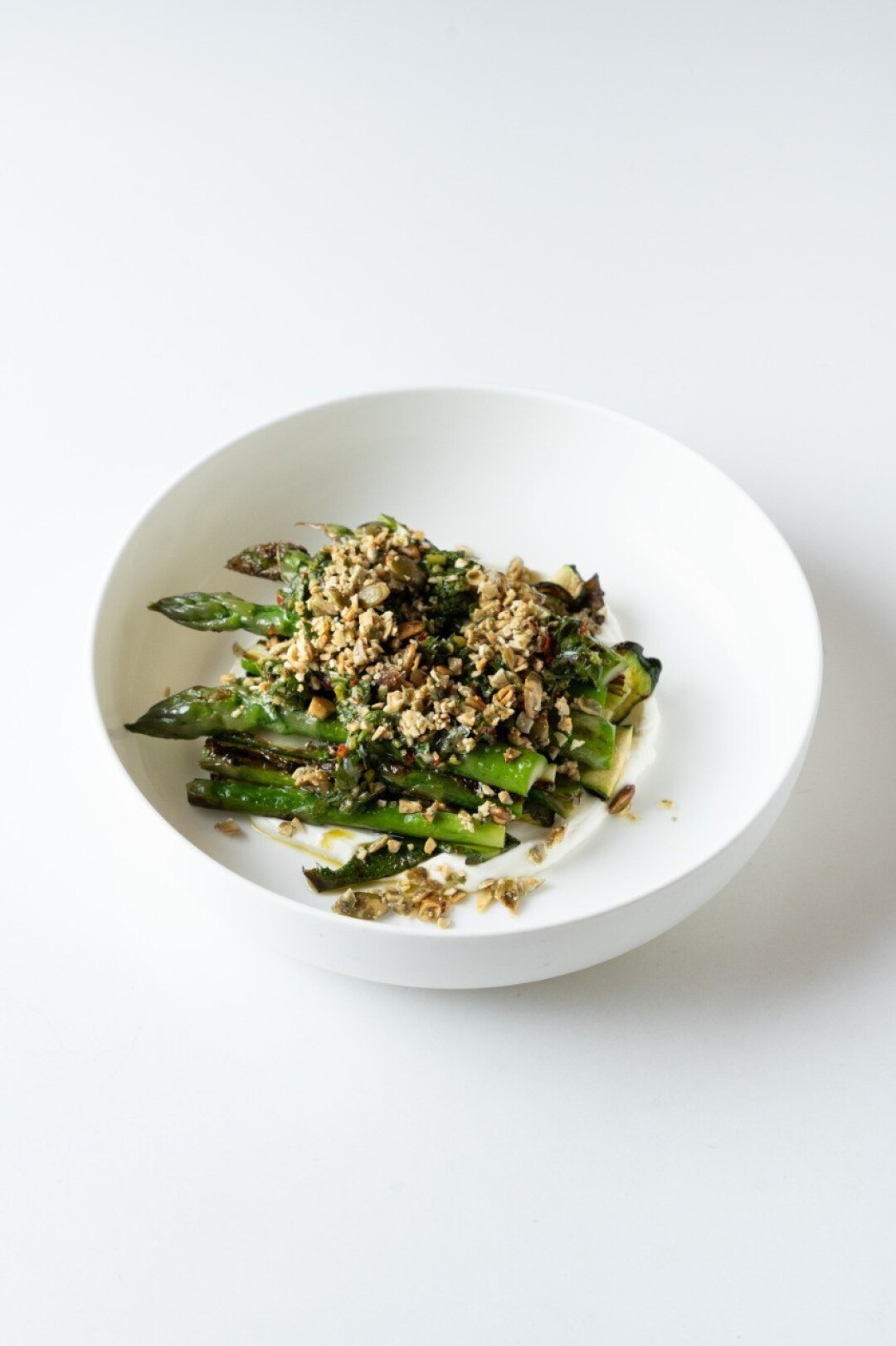 В ресторане от Duoband, где за главных — овощи, зеленую спаржу обжаривают на гриле, подают с кремом мацони, жареным цукини, пикантным соусом чимичурри.