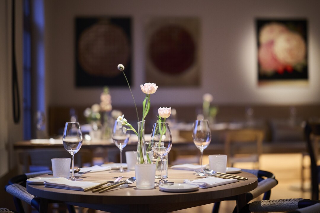 Сервировка в ресторане Алексея Алексеева — сплошной ремесленный кастом. Да, асимметричная посуда из костяного фарфора — от бельгийского бренда Serax, но салфетницы и подставки для приборов изготовлены вручную в старейшей стеклодувной мастерской при Академии Штиглица, стейковые ножи с рукоятью из карельской березы — от костромских ремесленников, а салфетки — это лен с ручной вышивкой из шелка.