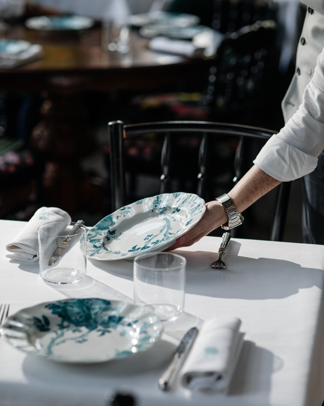 Тарелки для средиземноморского ресторана Марка Лапина произвел Императорский фарфоровый завод по спецзаказу: на кайме цветочный принт и канарейка, передающая привет птичке, что жила в семье Лапиных в Италии. А сицилийский узор на скатертях и лимонные деревья на террасе переносят сразу на вершину холмов Таормины.
