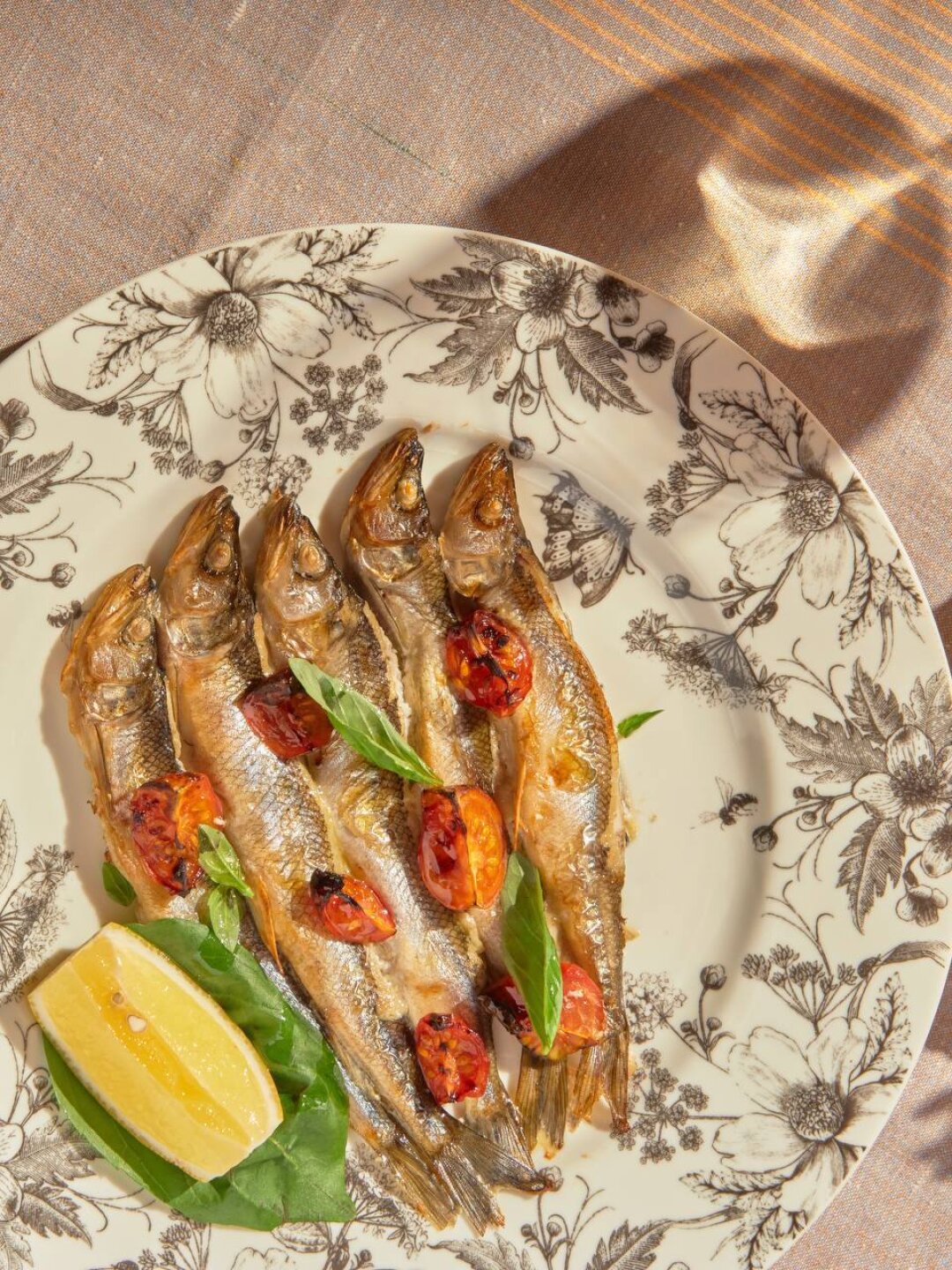 Корюшка может быть не обязательно жареной! Хозяйка гастроателье Карима Уразбаева маринует свежую рыбу в белом вине, а затем запекает с томатами черри.
