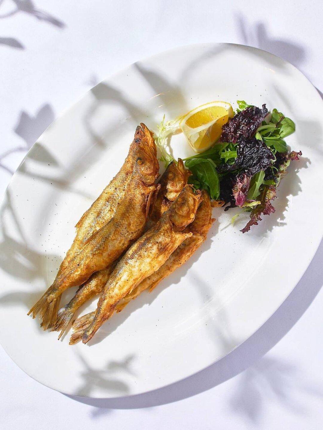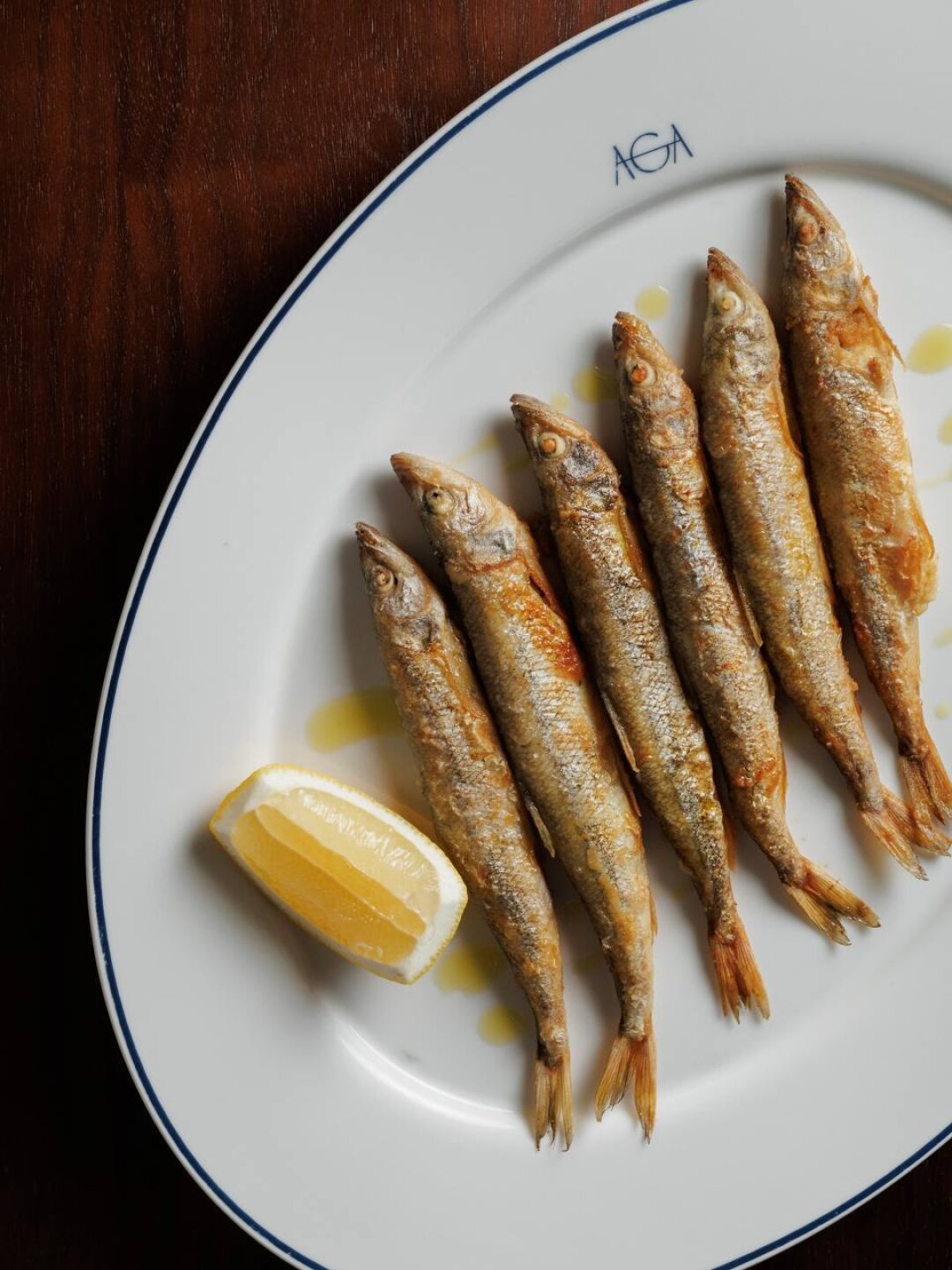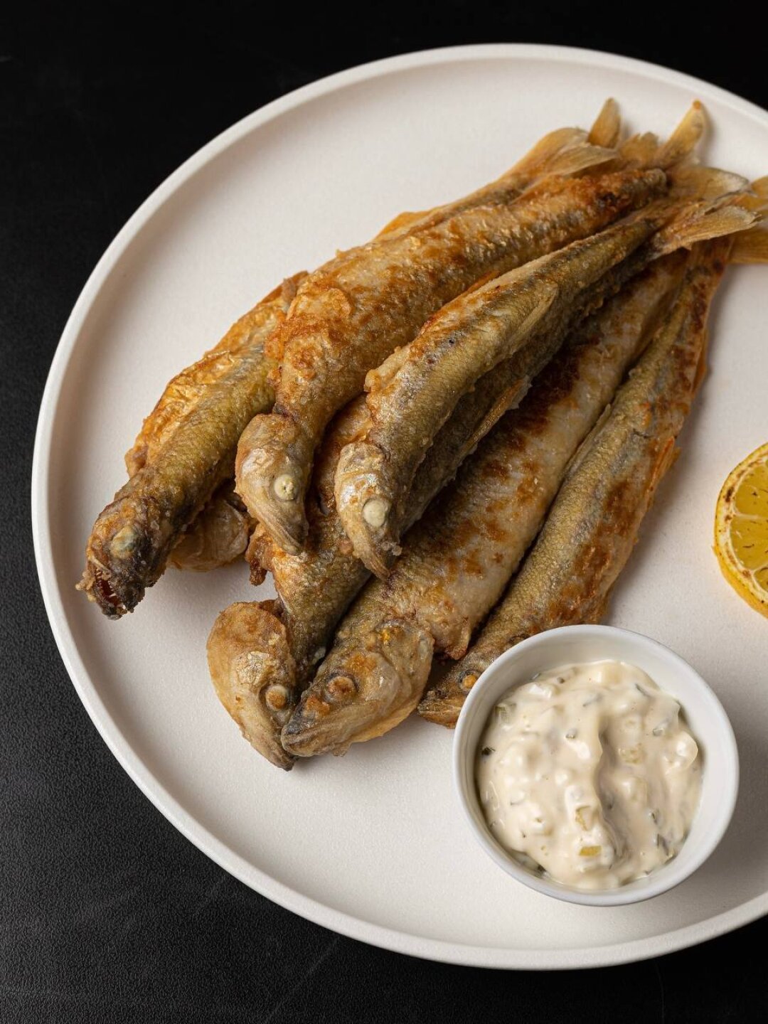 Подход к корюшке в AGA — качественный продукт и мастерство исполнения. Только золотистая корочка и долька лимона.
