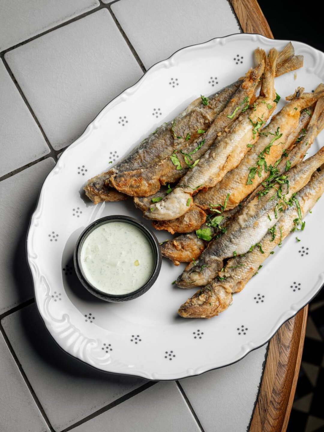 В ресторане арктической кухни корюшка не замерзает! Рыба исключительно суточного вылова, полная икры и обжаренная до легкой корочки. Подаётся с проверенным союзником — соусом тар-тар.