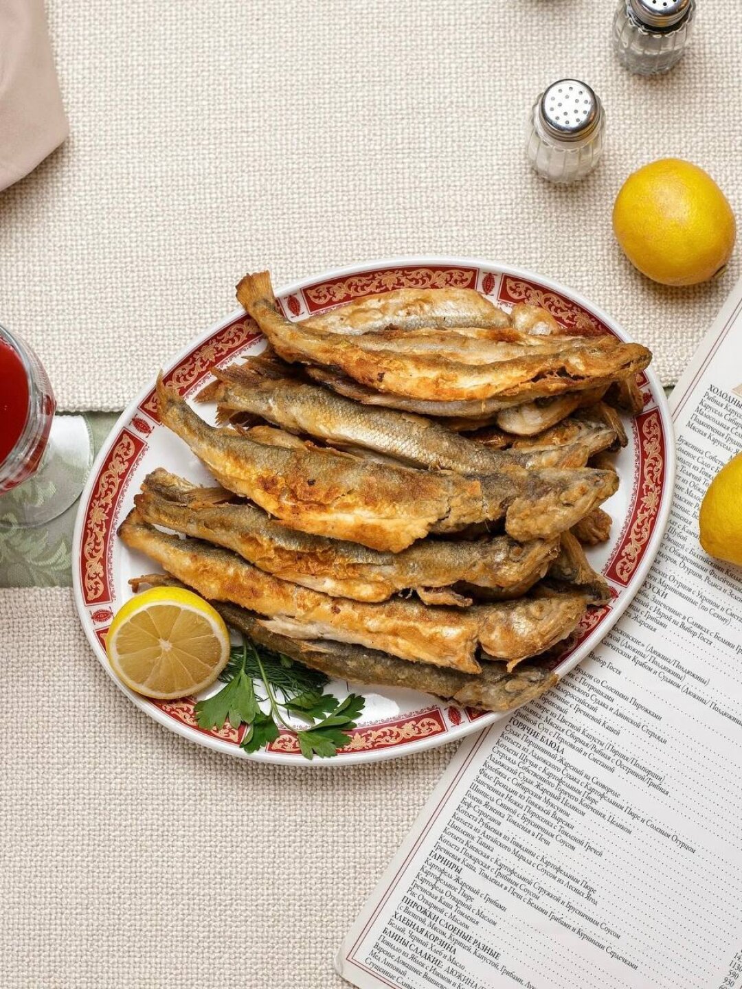 Завершаем экскурсию по Музею русской водки культурно-гастрономически: дегустацией экспонатов и жареной корюшкой по-ленинградски — с лимоном, зеленью, и свежемолотым перцем.