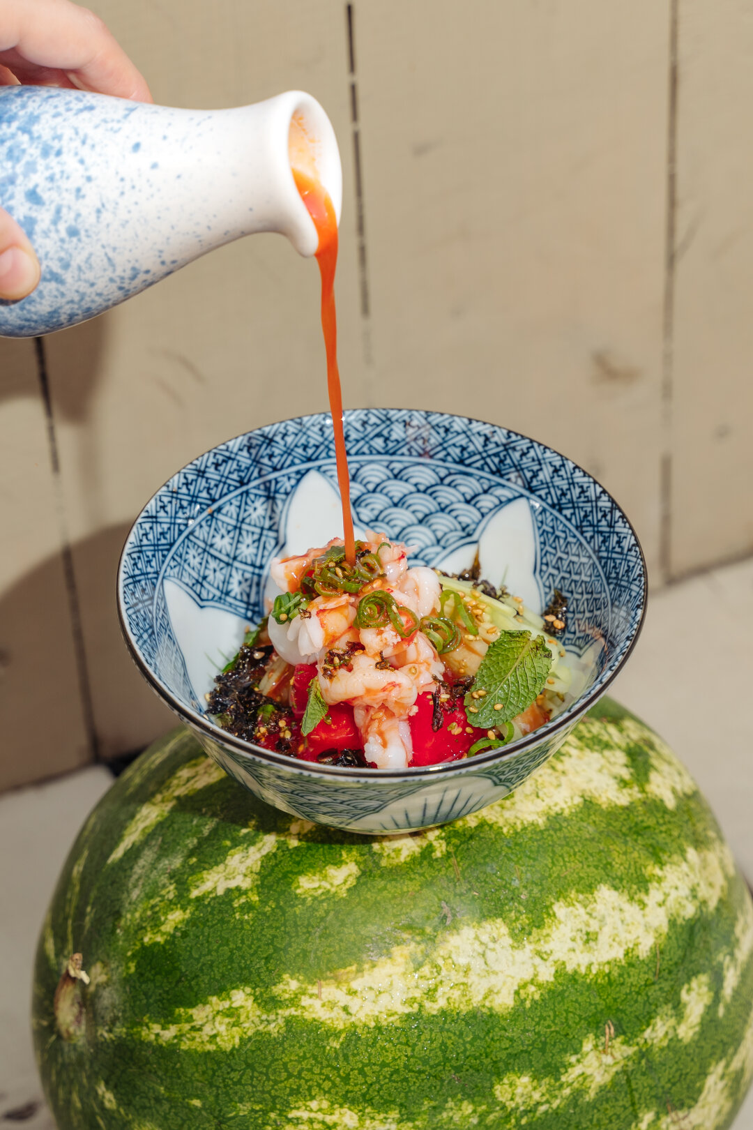 В коктейльном суши-ресторане с ярким граффити-двором запустили спешл-меню, где главную роль играют августовские бахчевые культуры. В севиче из тунца добавляют маринованный арбуз, роллы с гребешком и копченым мисо дополняют сальсой из дыни, гаспачо с огуречной лапшой и лангустинами заливают арбузным бульоном. При этом десерт подсвечивает другой сезонный фрукт — инжир — из него делают ганаш к чизкейку с соусом из листьев шисо.