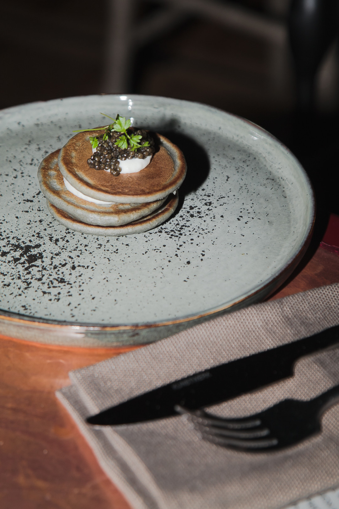 Помните, как у Ивана Алексеевича Бунина в «Чистом понедельнике»: «В трактире... купцы запивали огненные блины с зернистой икрой замороженным шампанским», — мысль та же, а детали другие! Черные оладьи с черной икрой и копченой сметаной гости обрамляли стопкой водки. А интерьер ресторана с исторической лепниной, отреставрированными подсвечниками и громадными люстрами только подчеркнул гастрономическую фольклорность вечера.