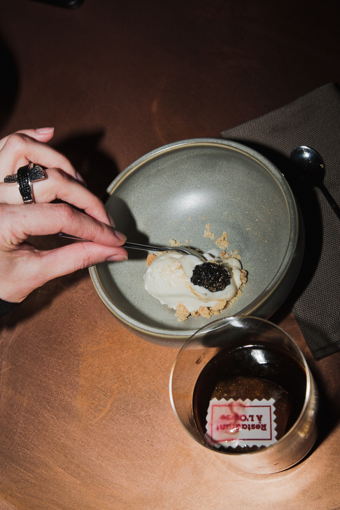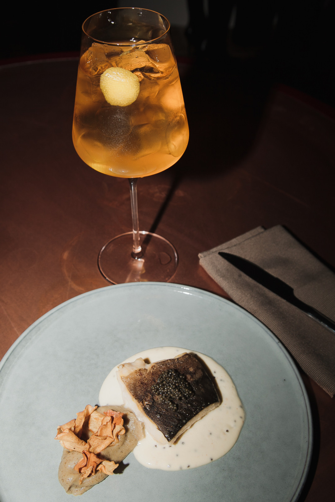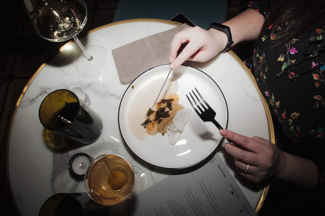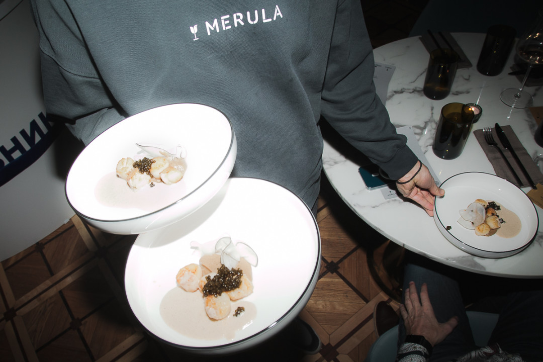 Гребешок с кремом из черной редьки и с забойной икрой гибрида осетра и калуги подавался с яблочным мартини, а стерлядь в шампанском с нежной забойной икрой и кремом из земляной груши сочеталась с грушевым мулом и настолько удачно, что вошла в основное меню Merula. На десерт — мороженое из цветной капусты с черной икрой и золотом и кофейный коктейль «Черный русский».