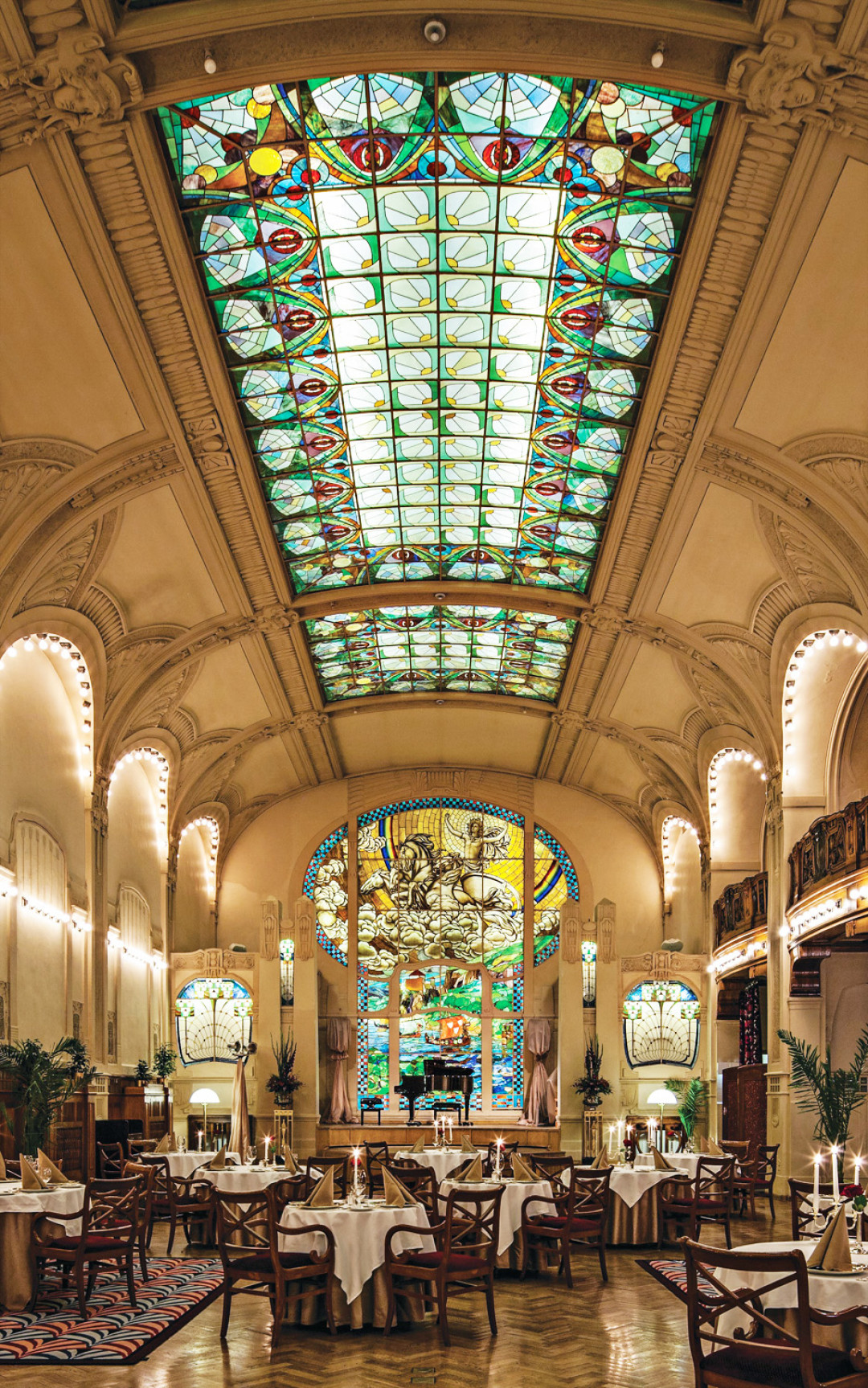 Разглядывать зал ресторана можно бесконечно: как ложится свет сквозь крышу из цветной мозаики работы художника Карла Бренцена, насколько величественен «Аполлон на колеснице» — витраж по эскизу зодчего Леонтия Бенуа. «Европа» — жемчужина архитектуры ар нуво начала XX века, и её бережно сохранили нетронутой.