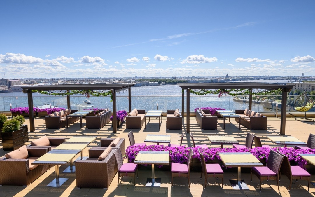 На крыше отеля «Санкт-Петербург», откуда открывается вид на акваторию Невы, гости могут послушать живую музыку, устроить свидание с бокалом игристого или организовать банкет на 80 человек. И все это на высоте 60 метров!