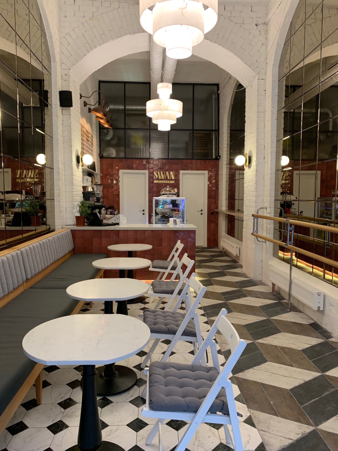 За дизайн кофейни, который тоже построен вокруг танцевальной тематики, отвечал Дмитрий Нил (московская кофейня 8/25). Он декорировал стены SWAN большими зеркалами и поставил балетный станок. Вход в заведение оформлен арочными дверьми, которые — если их распахнуть — создают единое с улицей пространство.