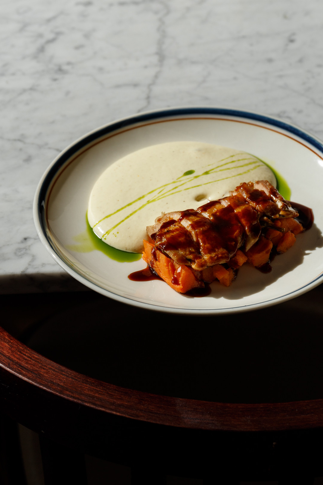 Кормят по итальянскому сценарию; часть рецептов привезена из путешествий. На кухне притворяются, что не делают из еды культа; в подаче эстетская небрежность. Говяжий тартар из раздела crudo непринужденно разлегся на тарелке под черным трюфелем и хлопьями пармезана; страчателла с пармой — это страчателла с пармой. Раздел bottega с бакалеей — здесь под инжирный джем можно собрать свою antipasti, и трюфельную салями, грана падана и терпкие оливки россыпью вам принесут на деревянной доске. Фокачча и хлеб свои.