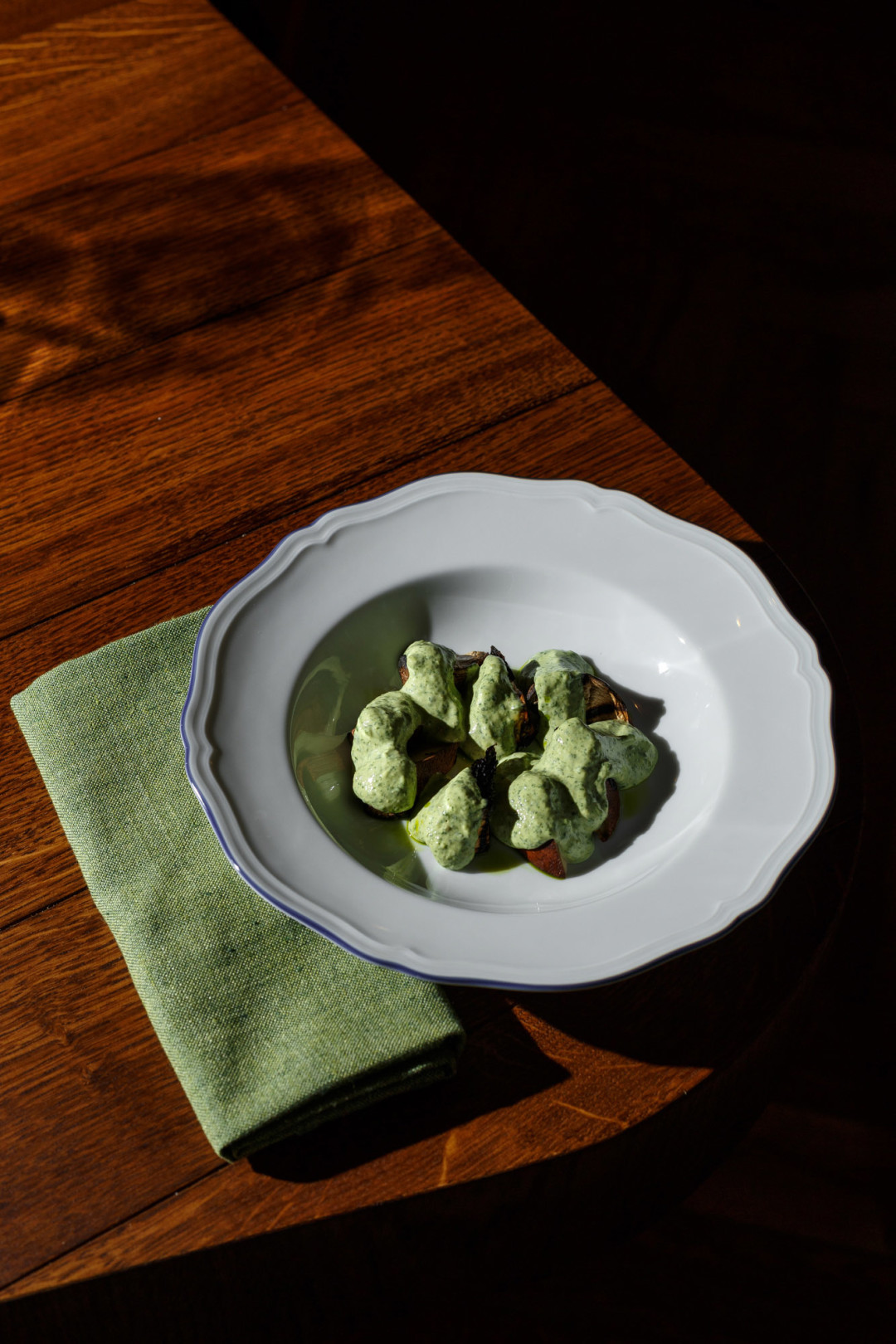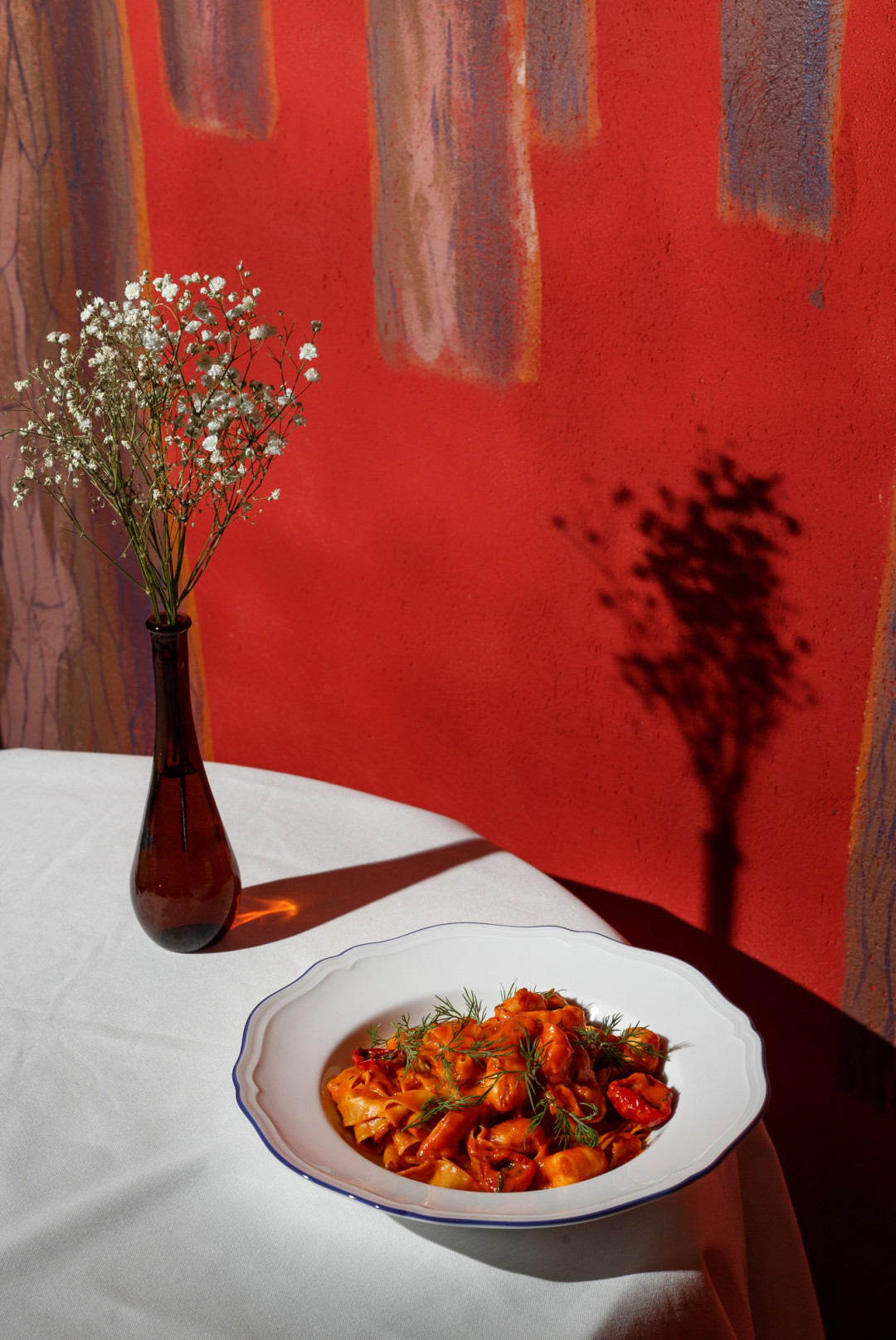 Интерьер делала Ксения Смирнова, она поделила ресторан на три условные зоны. Salone встречает вас латунным баром с сардинским мирто и ликерами на амальфитанских апельсинах. За раскидистыми фикусами — шкафы, полные манерных бокалов и франчакорты, и коммунальный стол — здесь история про большие компании, viva la vita и все такое. В глубине дальнего зала — пармезан в миске и весы для трюфелей, здесь потише и больше домашних ритмов, и тетушка на стиле итальянской хозяйки заворачивает шпинат в равиоли и начиняет тортелли пармой. Местная паста — особая гордость: спагетти, тальятелле и равиоли всегда свежие, для этого тетушка их и производит нон-стоп.