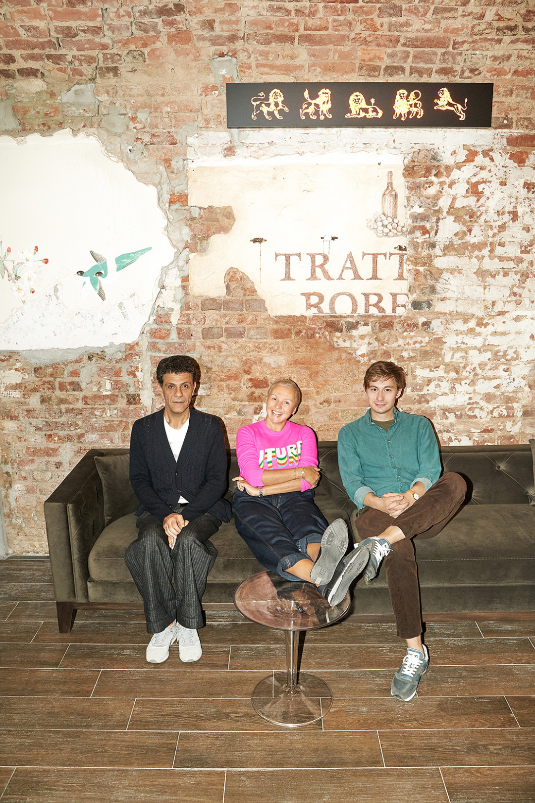 «То, что нас здесь окружает, — совершенно натуральный Петербург в том виде, в котором он есть сейчас. Убитый. Рядом театр, и ты как будто в декорациях, но декорации — подлинные, нет ничего фальшивого. Мне нравятся и балки, и остатки кирпича, фактура, многослойность. Хотелось минимально вмешиваться в этот фон. И мы не стали вмешиваться».