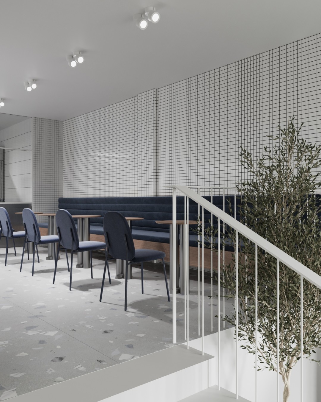 Минималистичный интерьер разрабатывала студия Hon. В оформлении использовали бело-синюю цветовую гамму, дерево, зеркала и растения.