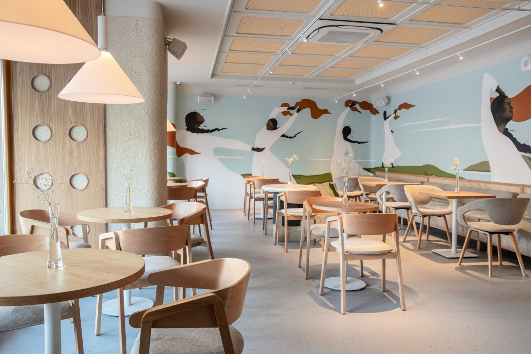 Стены украсила художница Наталья Занчевская, чьи работы находятся в частных коллекциях не только в России, но и США, Германии, Испании, Великобритании и Франции. Сложные движения каждой изображенной фигурой компенсируются простотой цветовой гаммы и плоскими силуэтами.